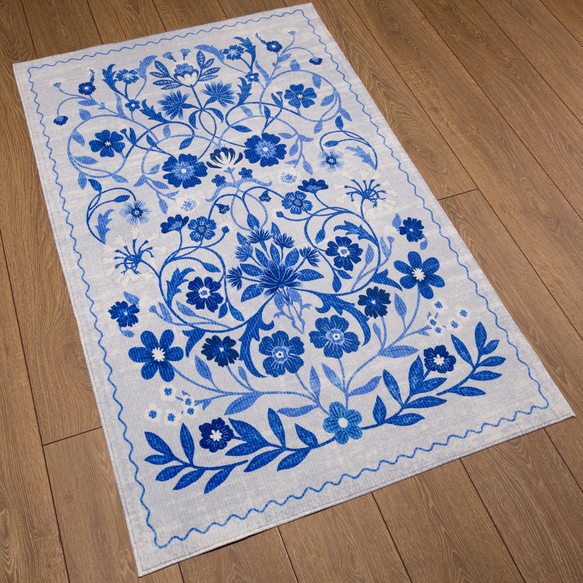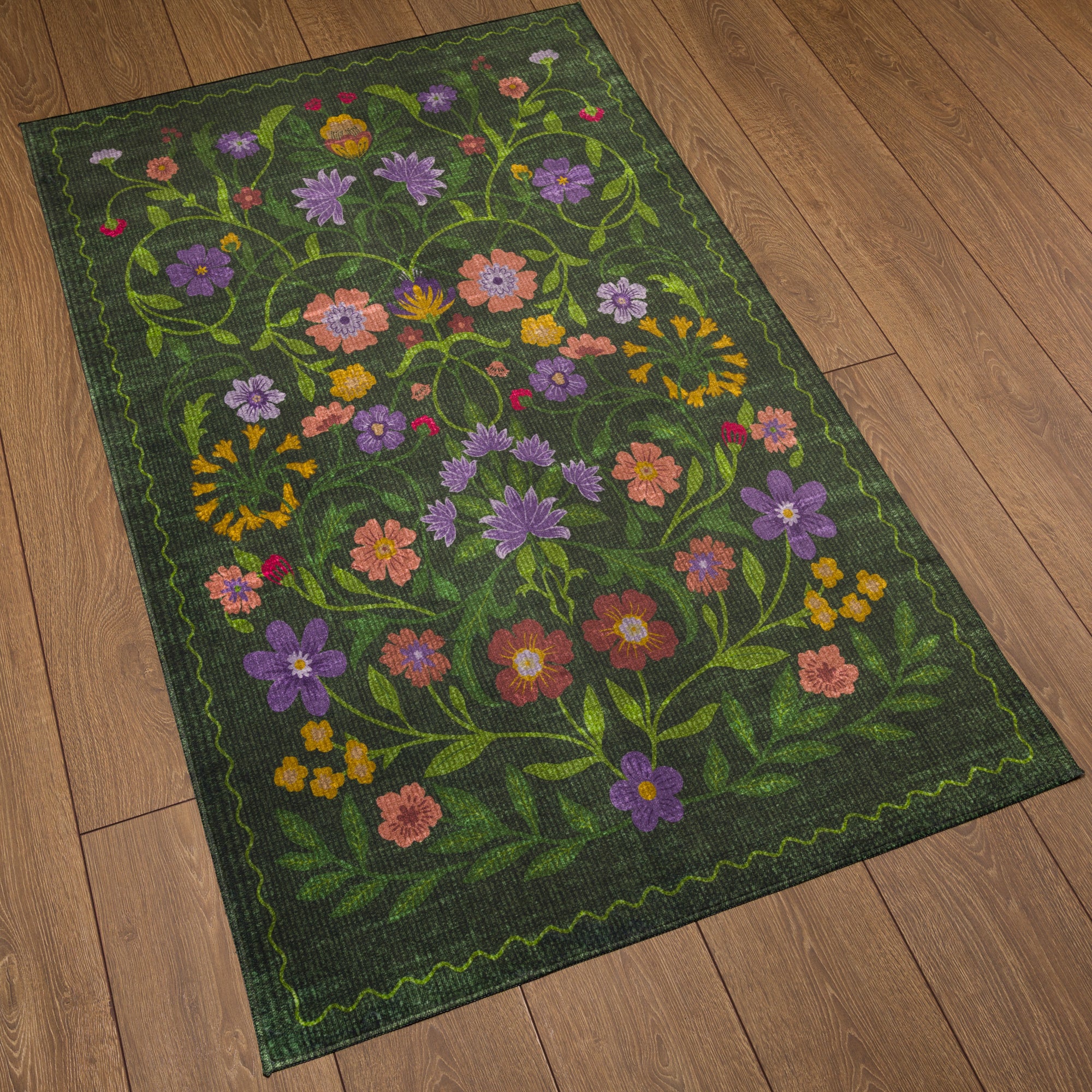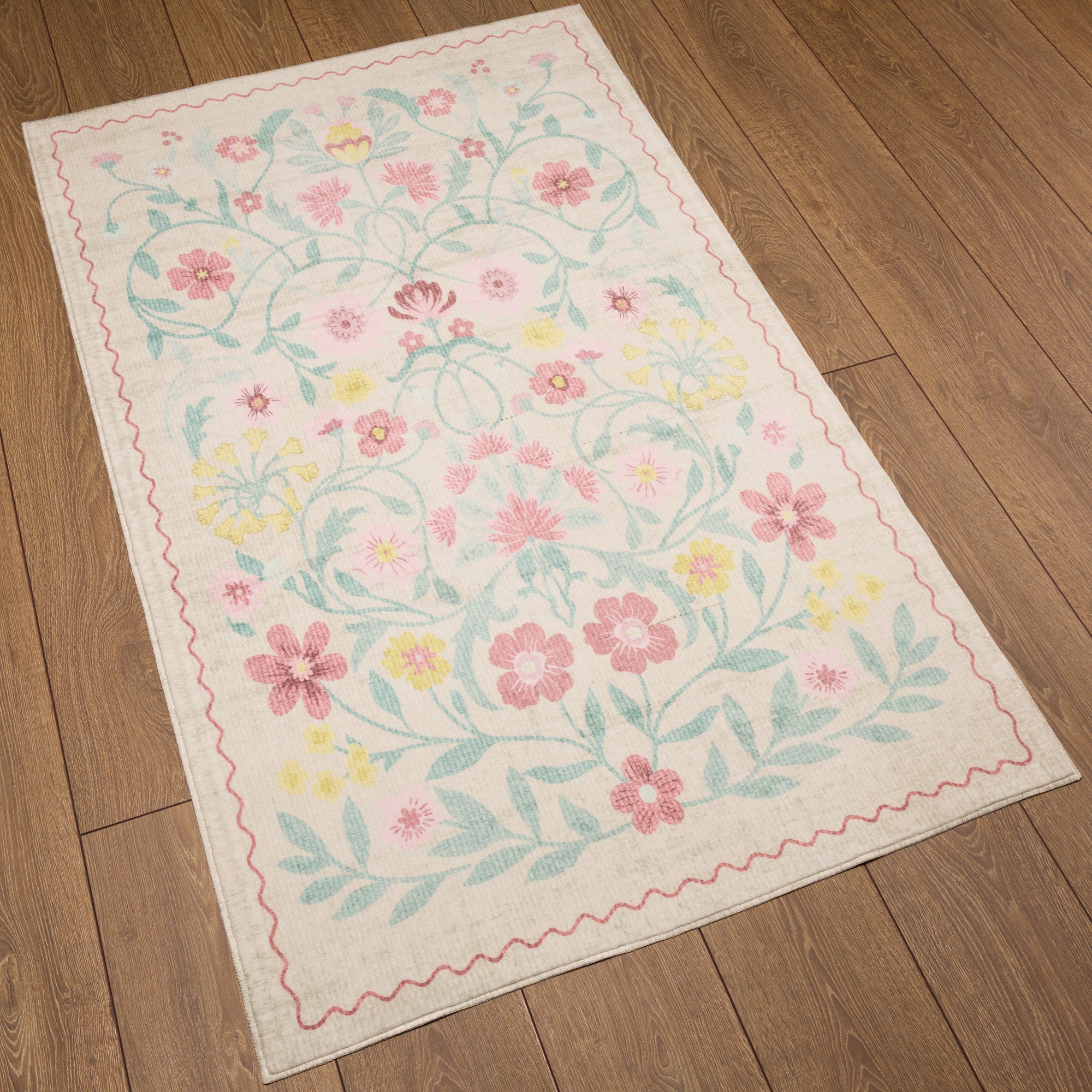 A whimsical floral rug with delicate symmetry and charming botanical motifs. Camille brings a touch of playful elegance with its blooming garden aesthetic, perfect for cozy interiors or vibrant accents. The intricate floral layout and wavy border create a graceful yet artistic look that feels both fresh and timeless.