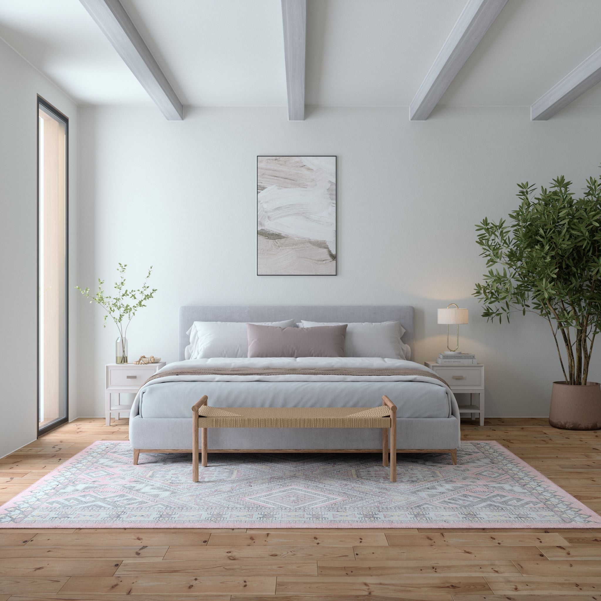 When selecting the perfect rug size, consider the size of your bed as a key factor. A large area rug placed under the bed often serves as the room’s focal point. Alternatively, a smaller rug beside the bed adds a nice accent and provides a cozy spot for your feet.