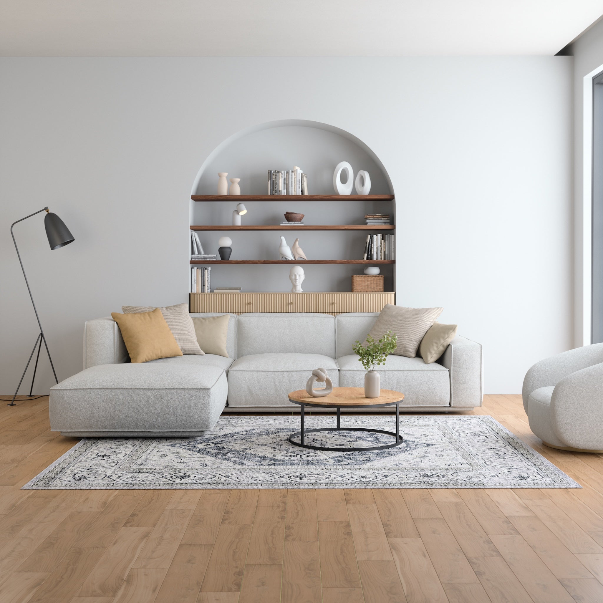 A softly distressed medallion anchors the Emme rug in timeless charm. Subtle greys and muted tones blend in an intricate Persian-style pattern, adding quiet sophistication to both classic and modern spaces. A refined choice for creating a serene and elevated atmosphere.
