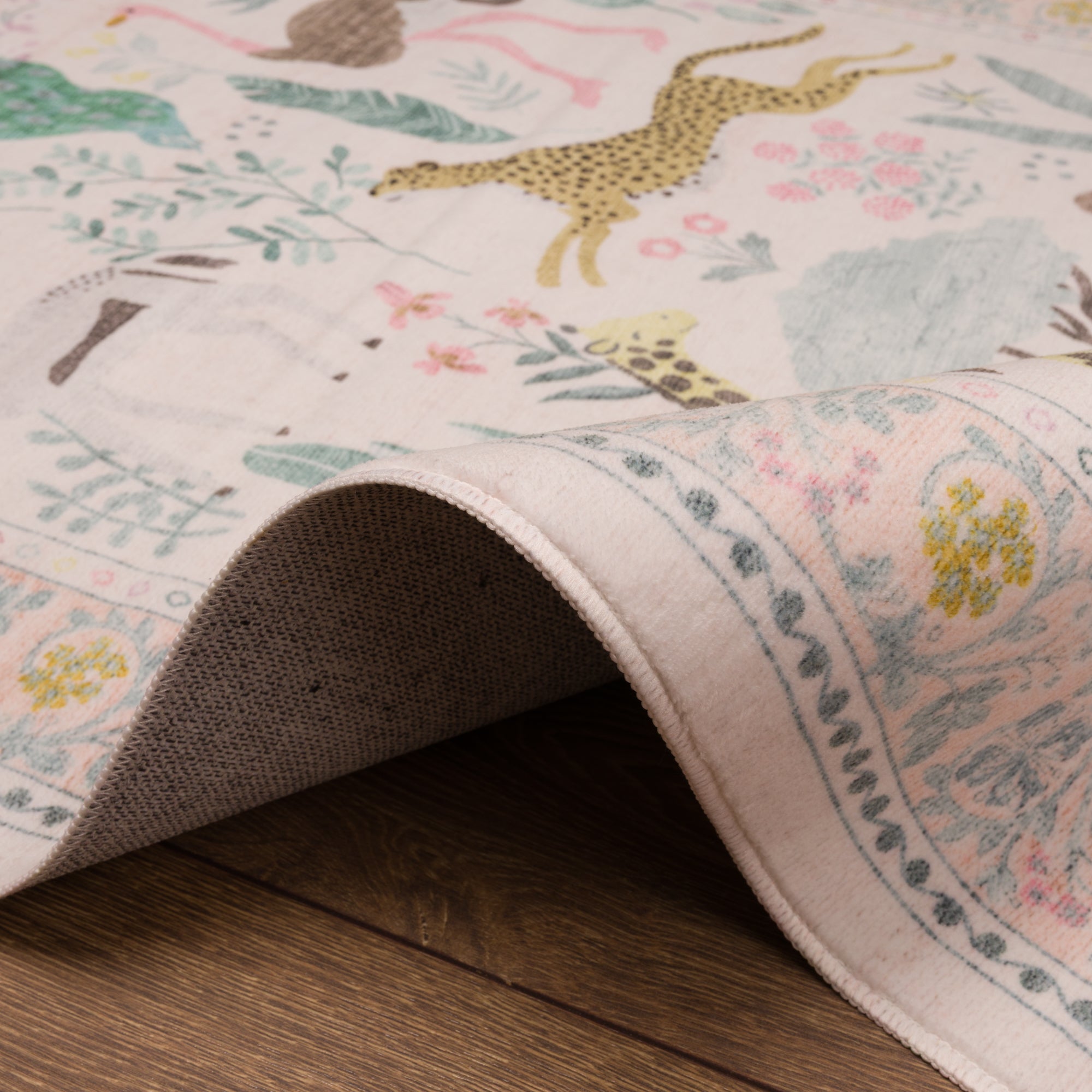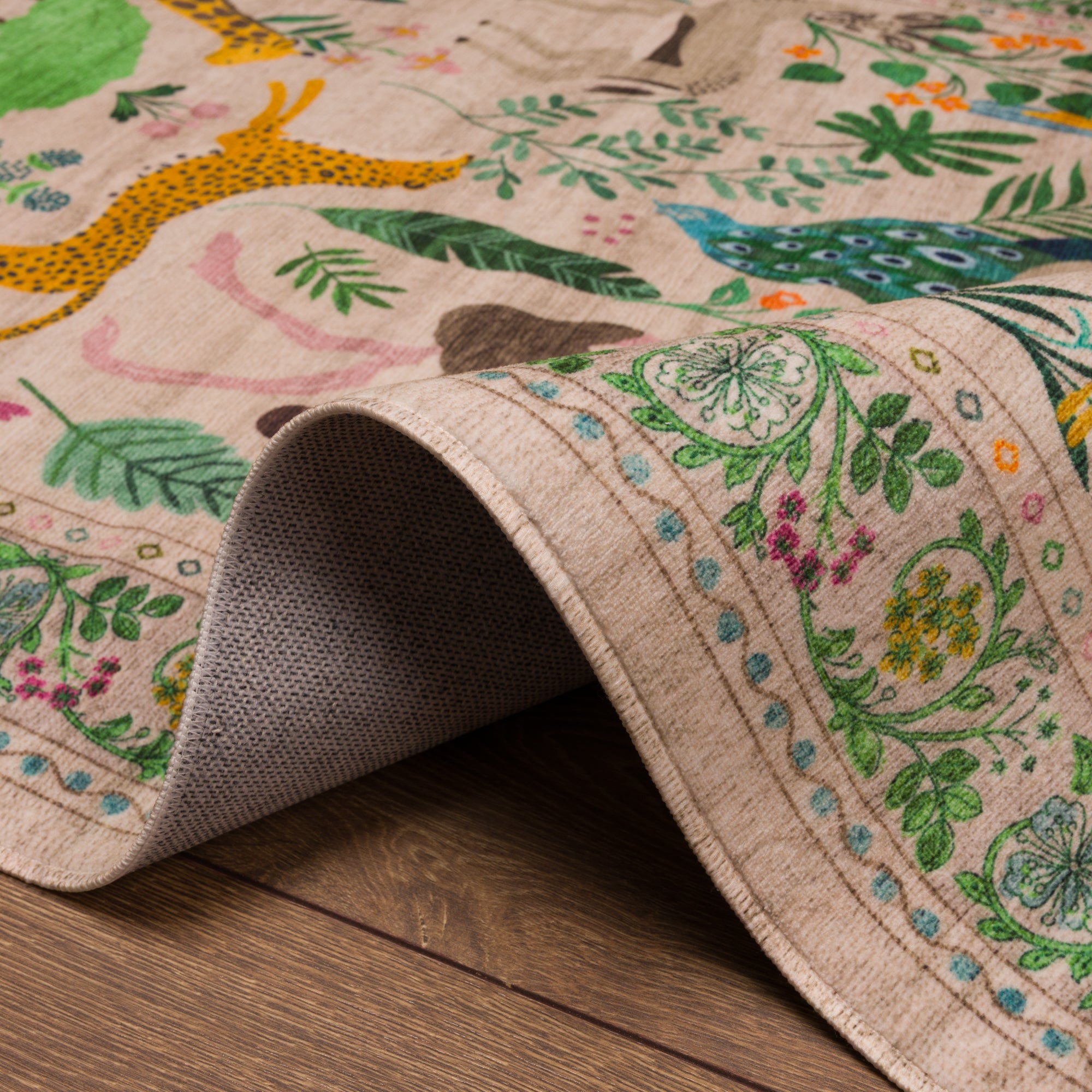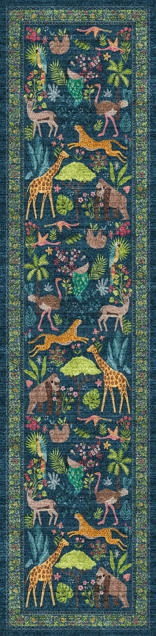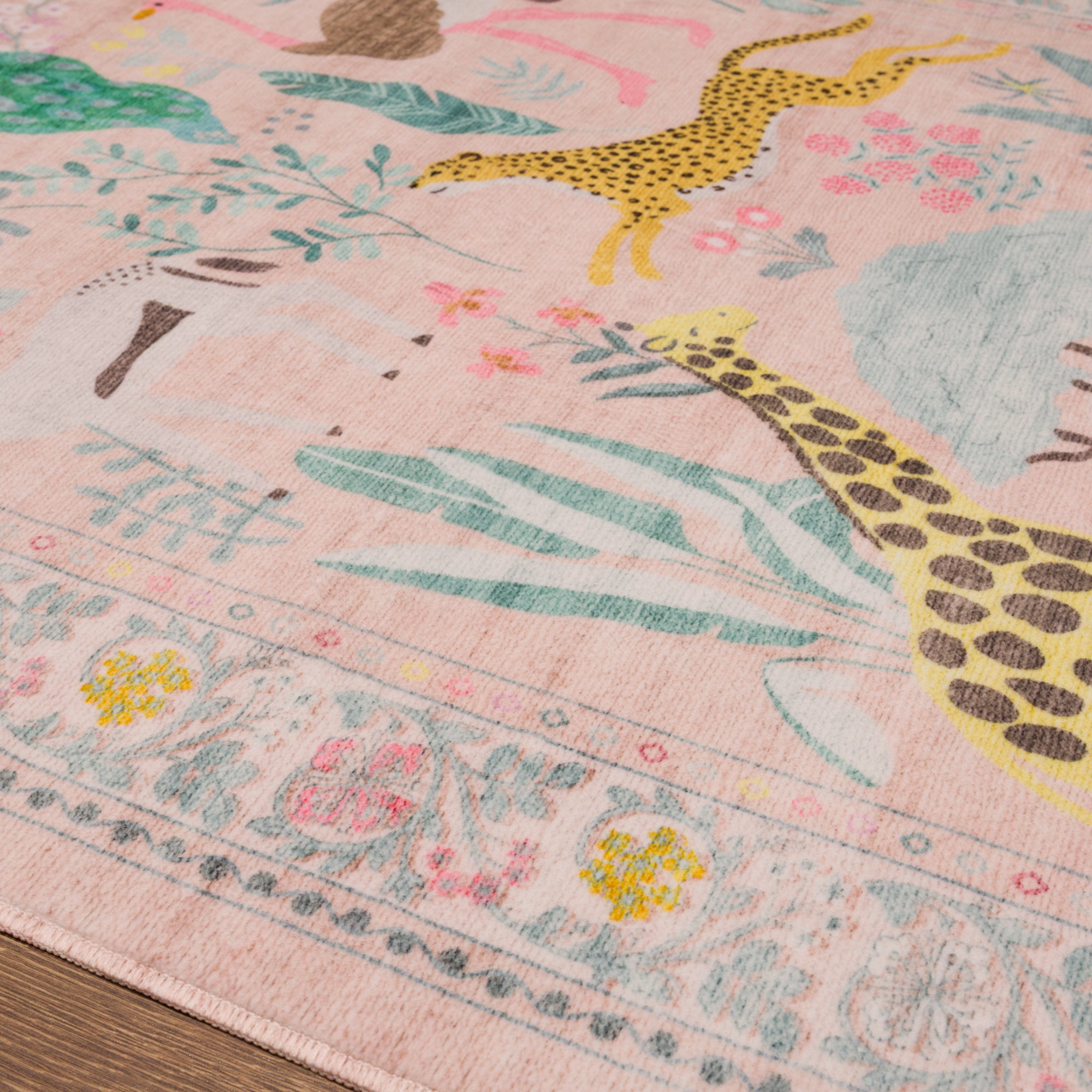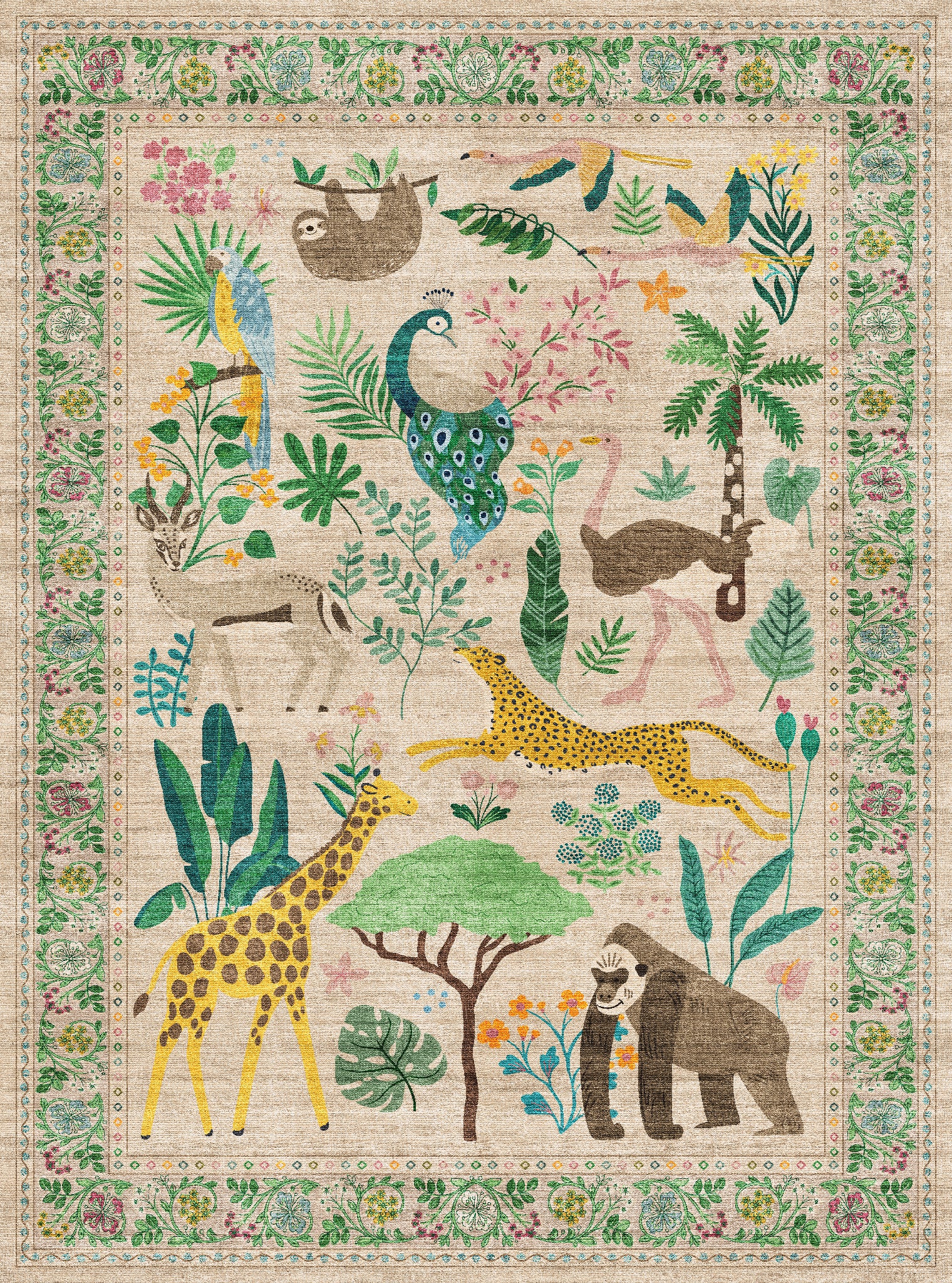 Turn your space into a playful jungle with the Kya rug, featuring hand-drawn animals like giraffes, cheetahs, sloths, parrots, and gorillas nestled among lush tropical plants. Framed with a decorative floral border, Kya adds a whimsical yet stylish touch to any room. It’s the perfect blend of fun and charm for nurseries, kids’ rooms, or bold interiors.