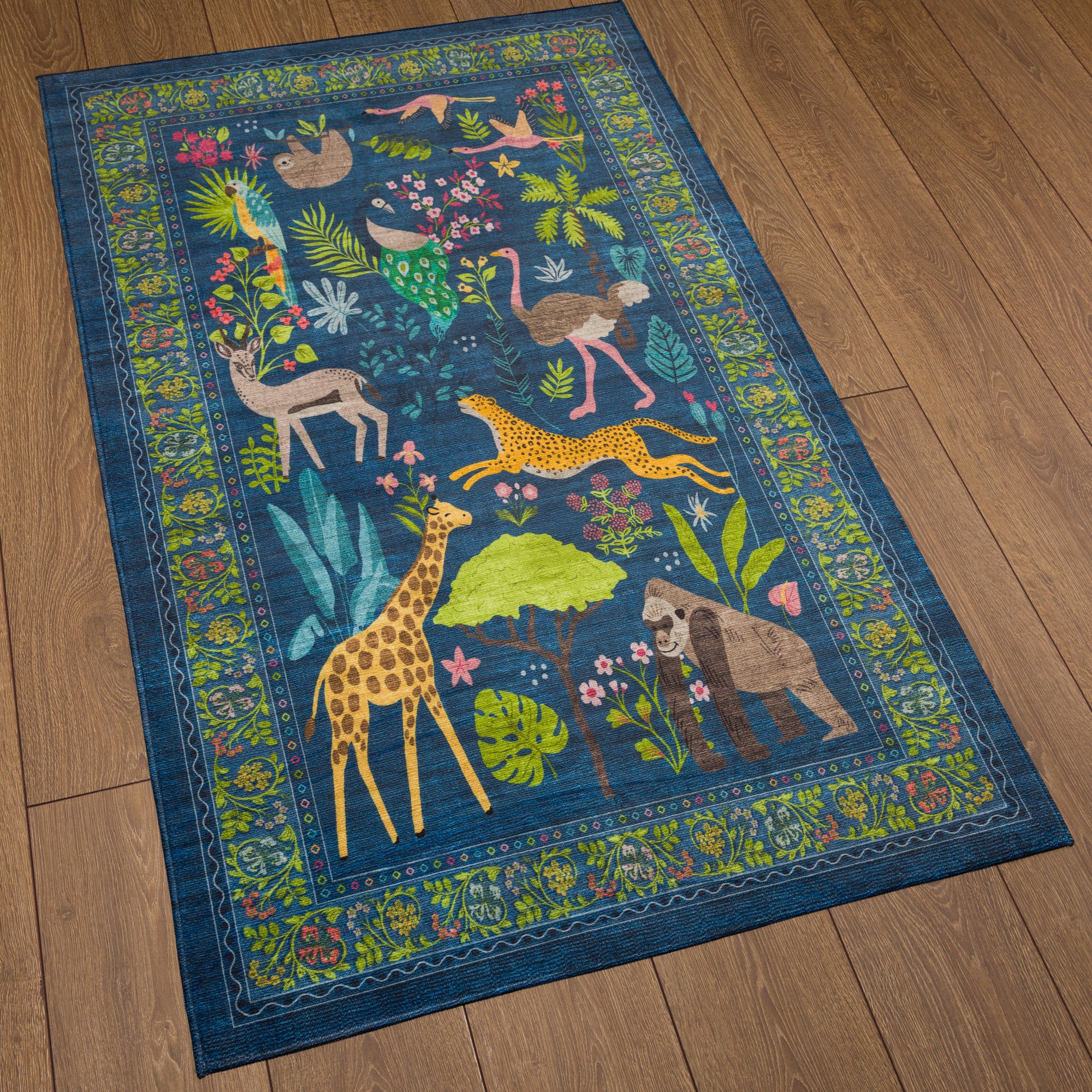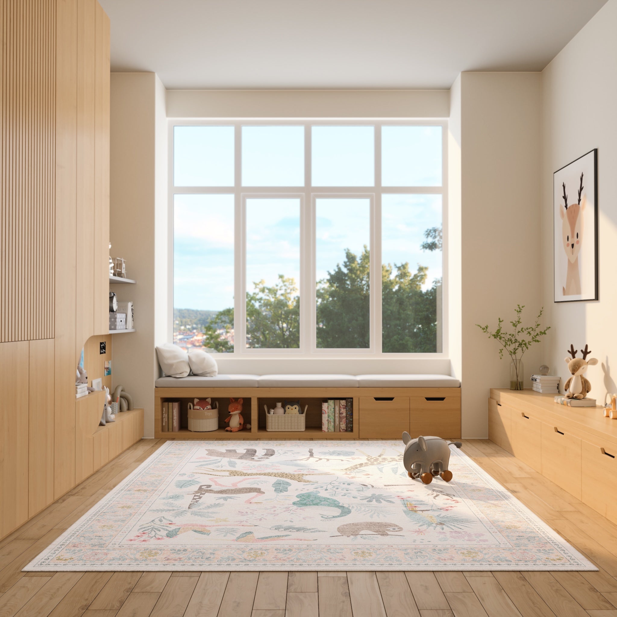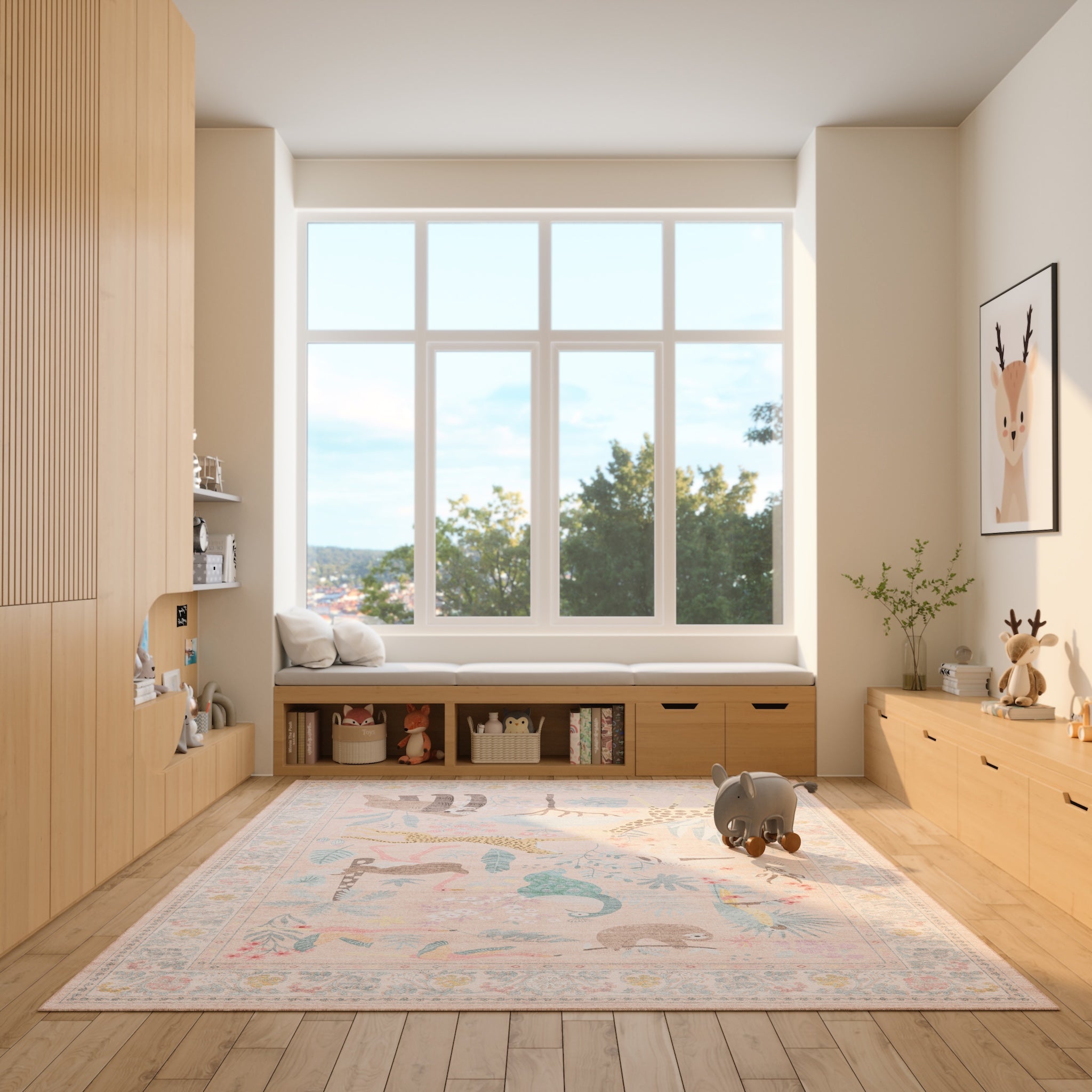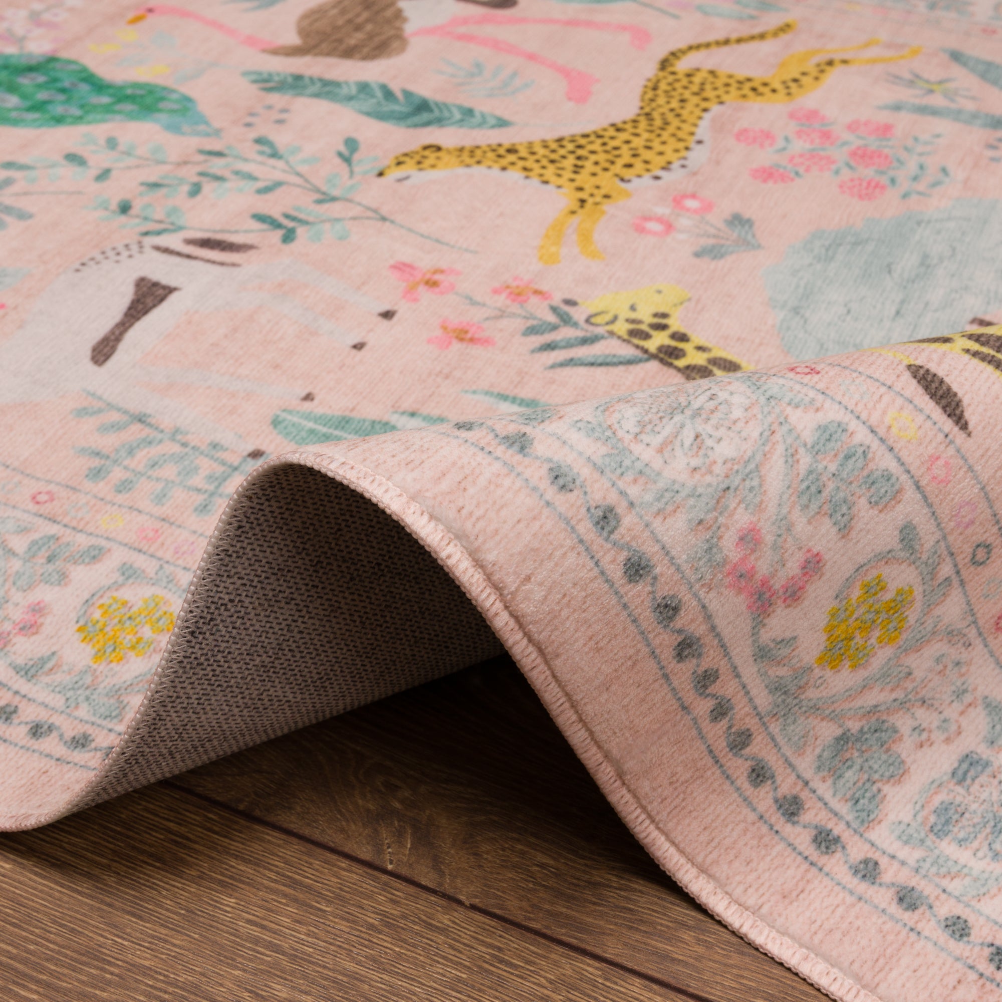 Turn your space into a playful jungle with the Kya rug, featuring hand-drawn animals like giraffes, cheetahs, sloths, parrots, and gorillas nestled among lush tropical plants. Framed with a decorative floral border, Kya adds a whimsical yet stylish touch to any room. It’s the perfect blend of fun and charm for nurseries, kids’ rooms, or bold interiors.