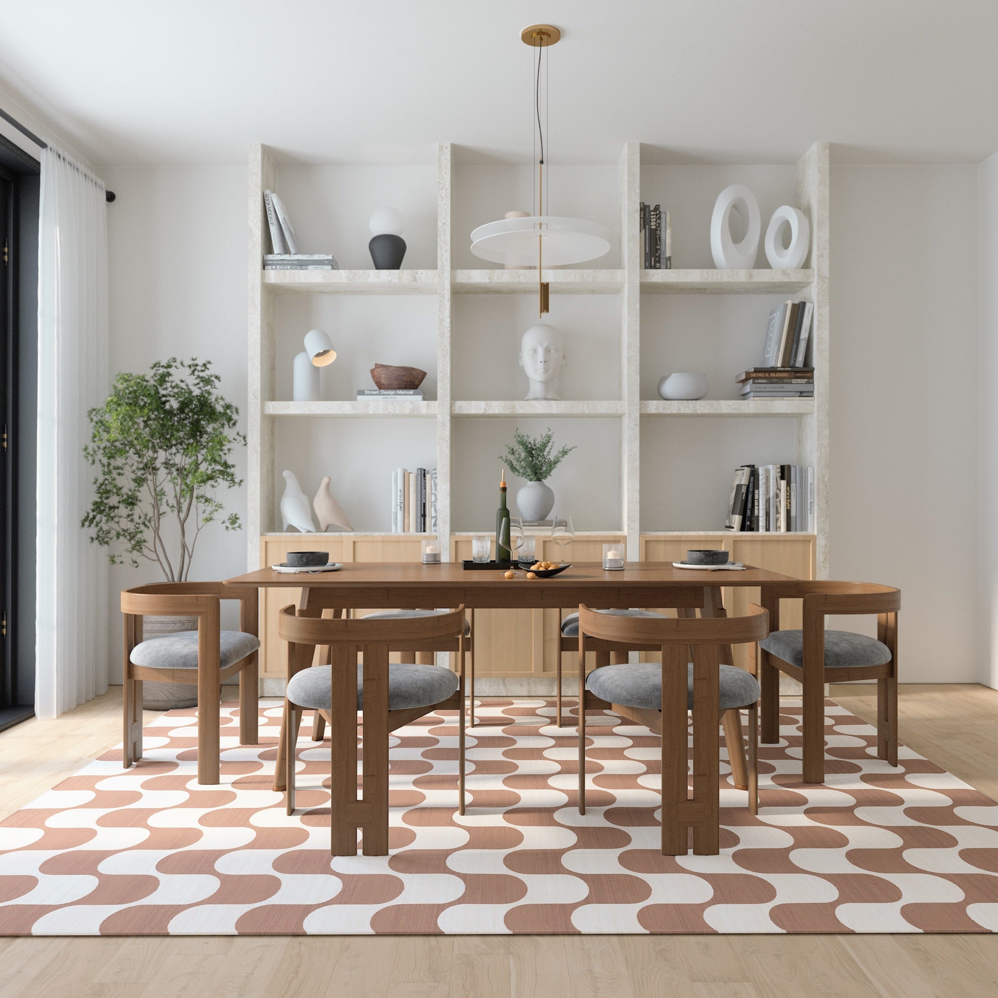 A helpful guideline is to choose a rug that extends about four feet beyond your dining table. This ensures that all dining chairs remain fully on the rug, even when they are pulled out.