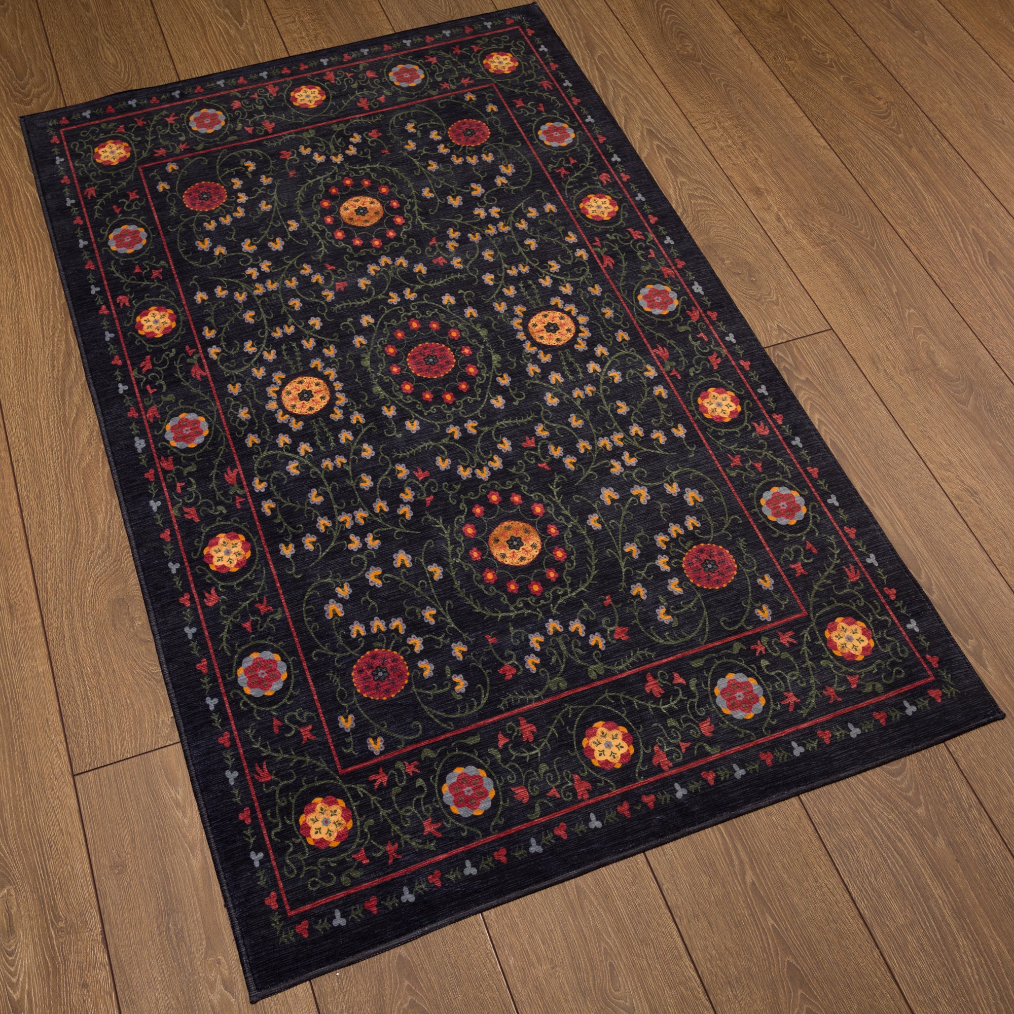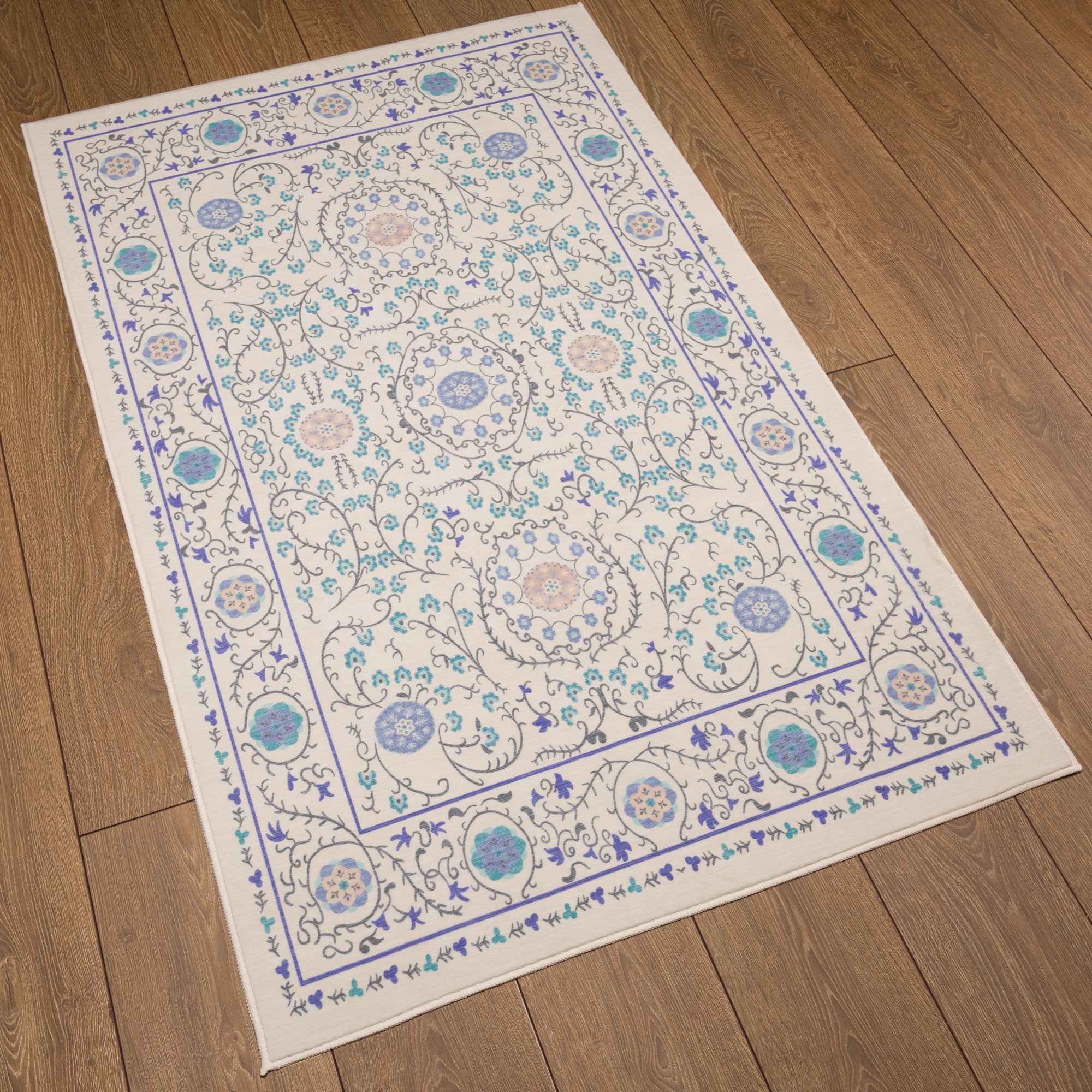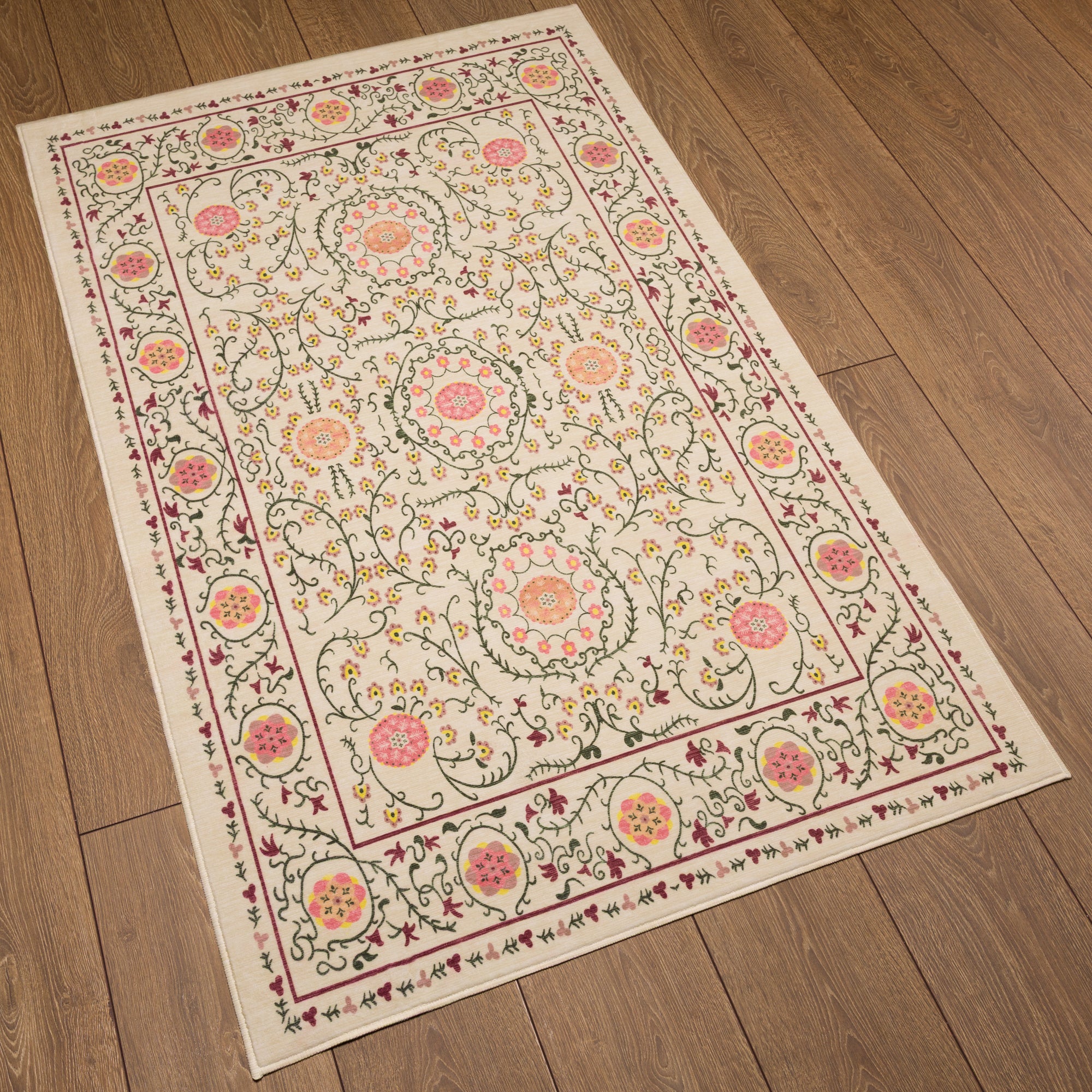 The Rosalie rug boasts a delicate floral pattern with ornamental medallions, adding a graceful and timeless touch to any space. Its intricate detailing and soft color palette make it a versatile addition to living rooms, bedrooms, or dining areas. This machine washable rug offers both aesthetic beauty and practical ease, making it an excellent choice for homes with high-traffic areas.