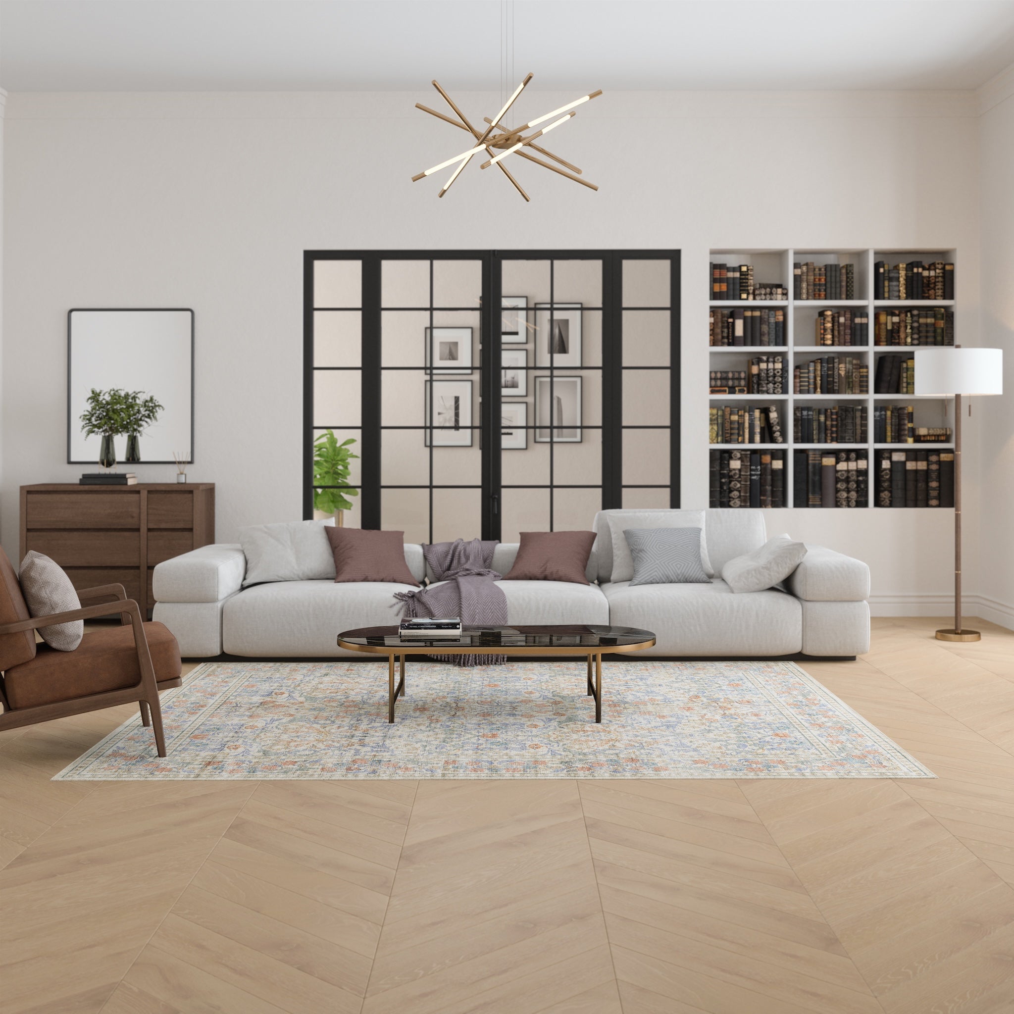 The Sabine rug blends timeless floral motifs with a vintage-inspired aesthetic, featuring intricate ornamental detailing in soft, faded tones. Its delicate symmetry and distressed finish evoke the charm of traditional Persian rugs, offering a sophisticated yet cozy statement for your space.