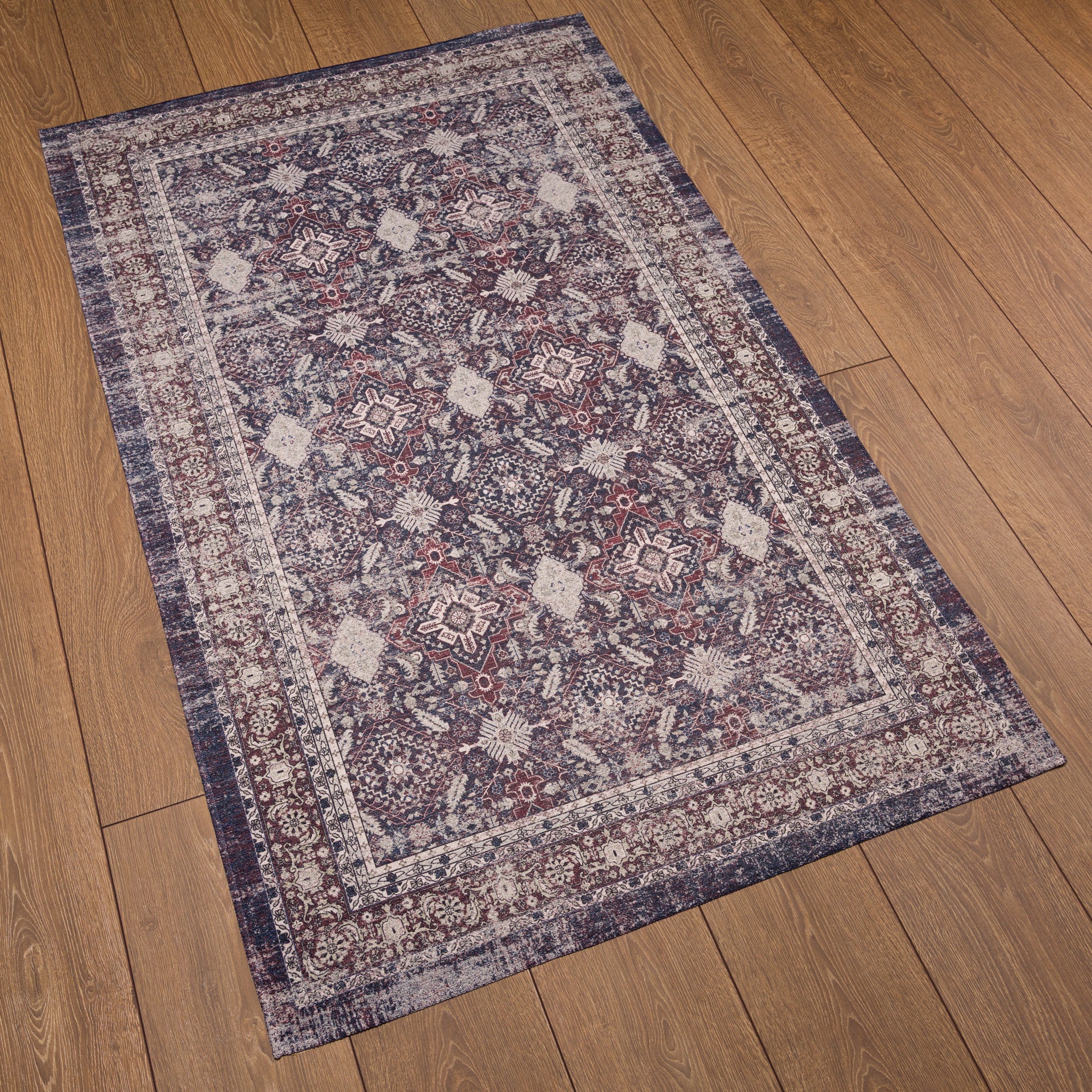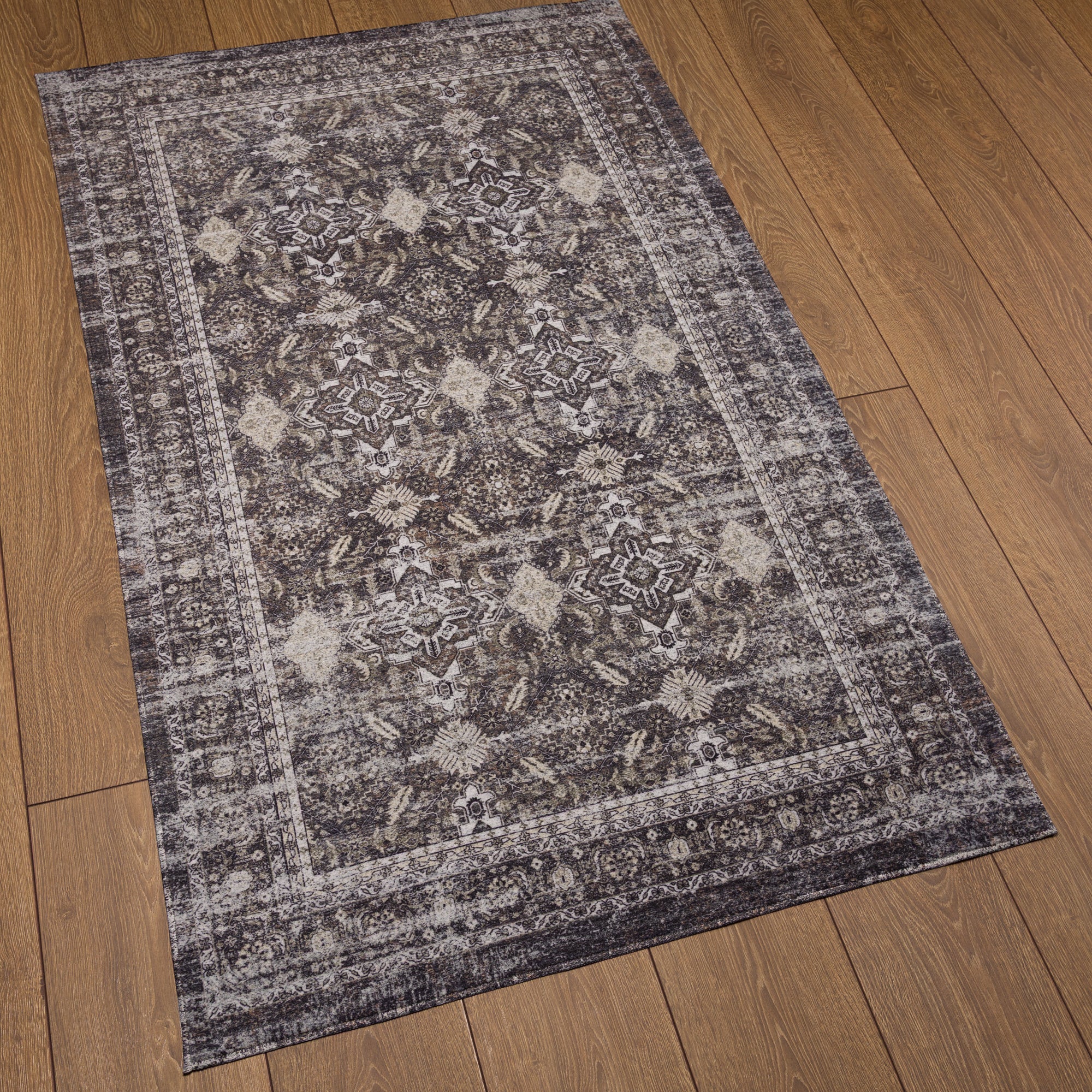 The Sera rug showcases a beautifully ornate pattern with intricate detailing, blending modern and traditional elements for a timeless look. Its distressed design adds depth and character, making it a versatile addition to living rooms, dining spaces, or bedrooms. With its washable fabric, this rug offers both elegance and practicality, perfect for high-traffic areas.