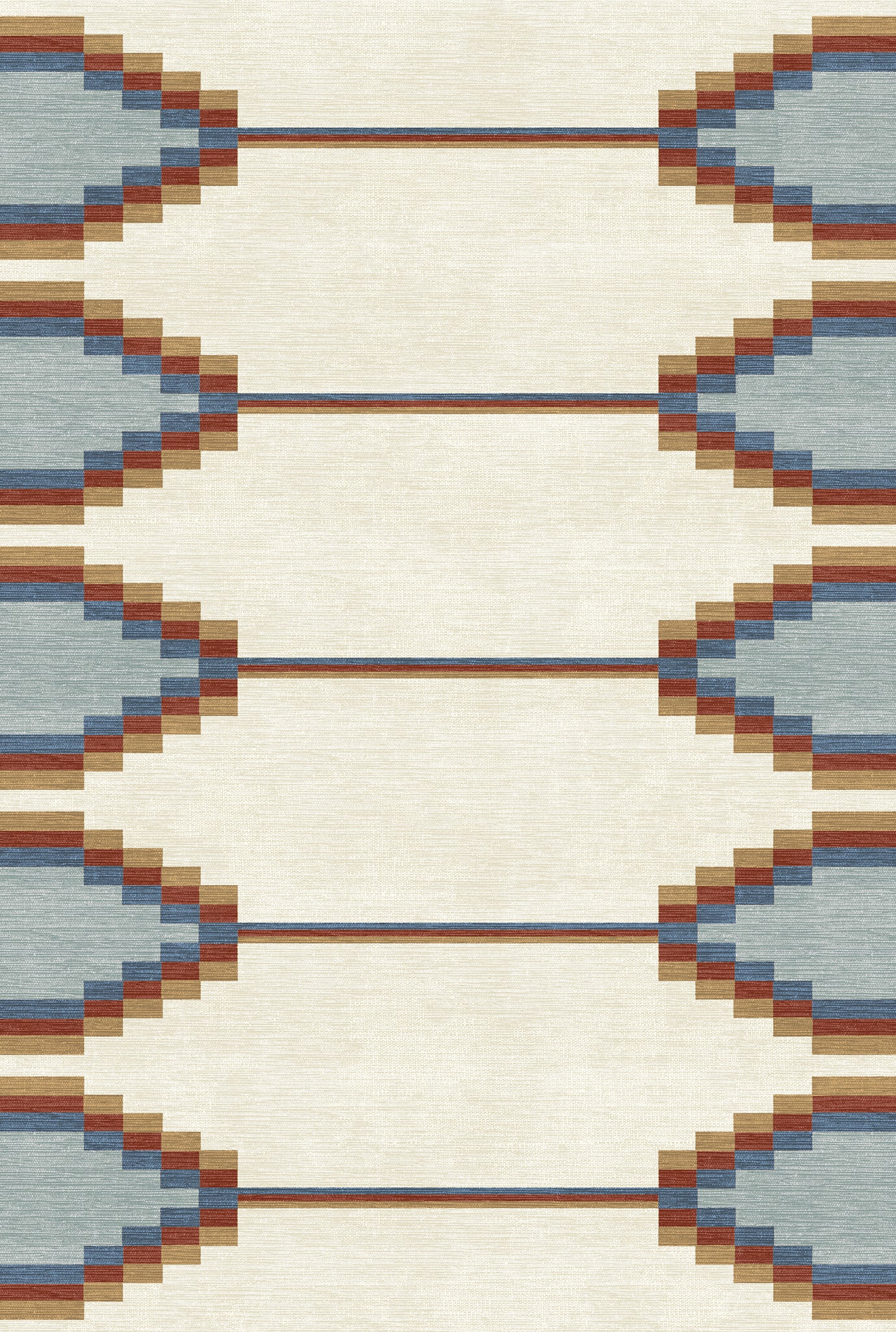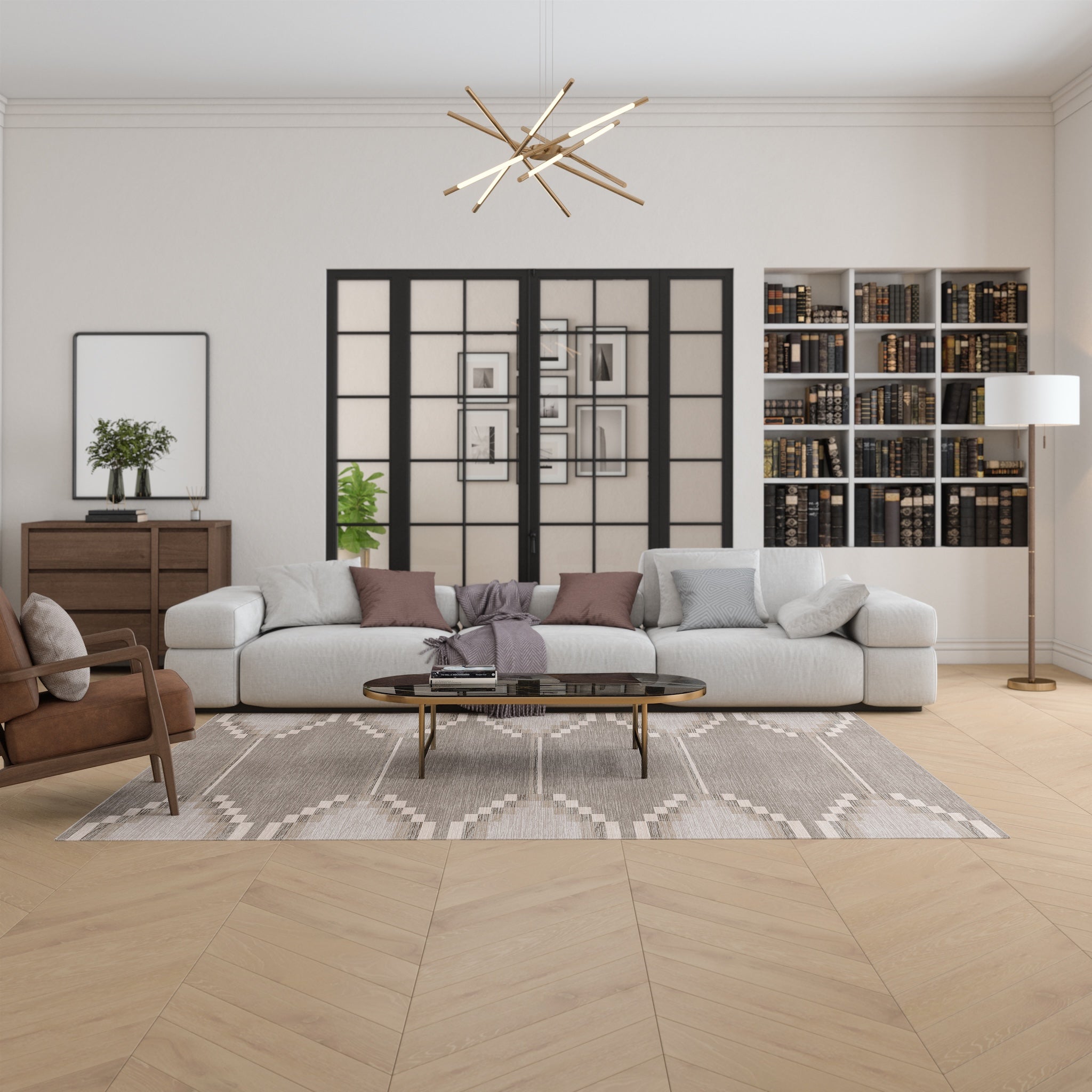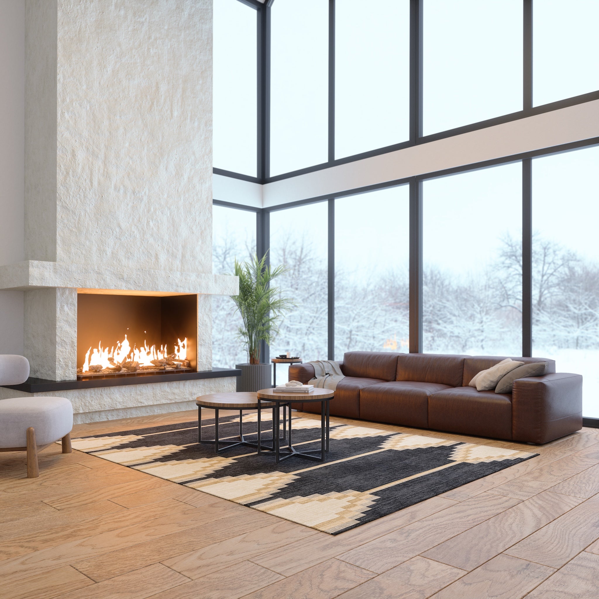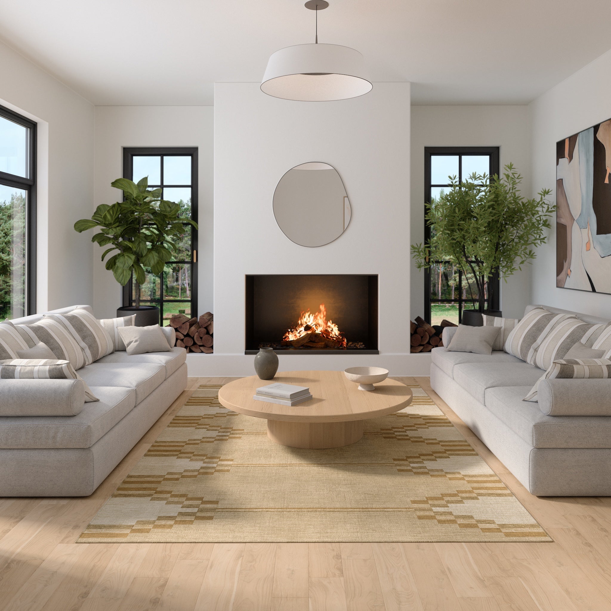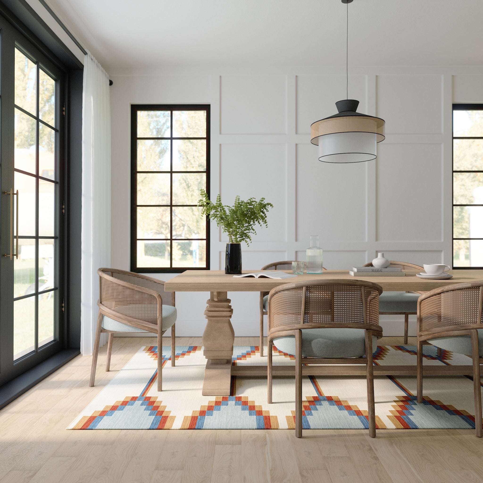 The Sierra rug features a bold geometric pattern with Southwestern-inspired elements, bringing a modern edge to any room. Its structured design and neutral tones offer a striking balance of simplicity and detail. This machine washable rug is both practical and stylish, making it an ideal addition to living rooms, dining areas, or offices.