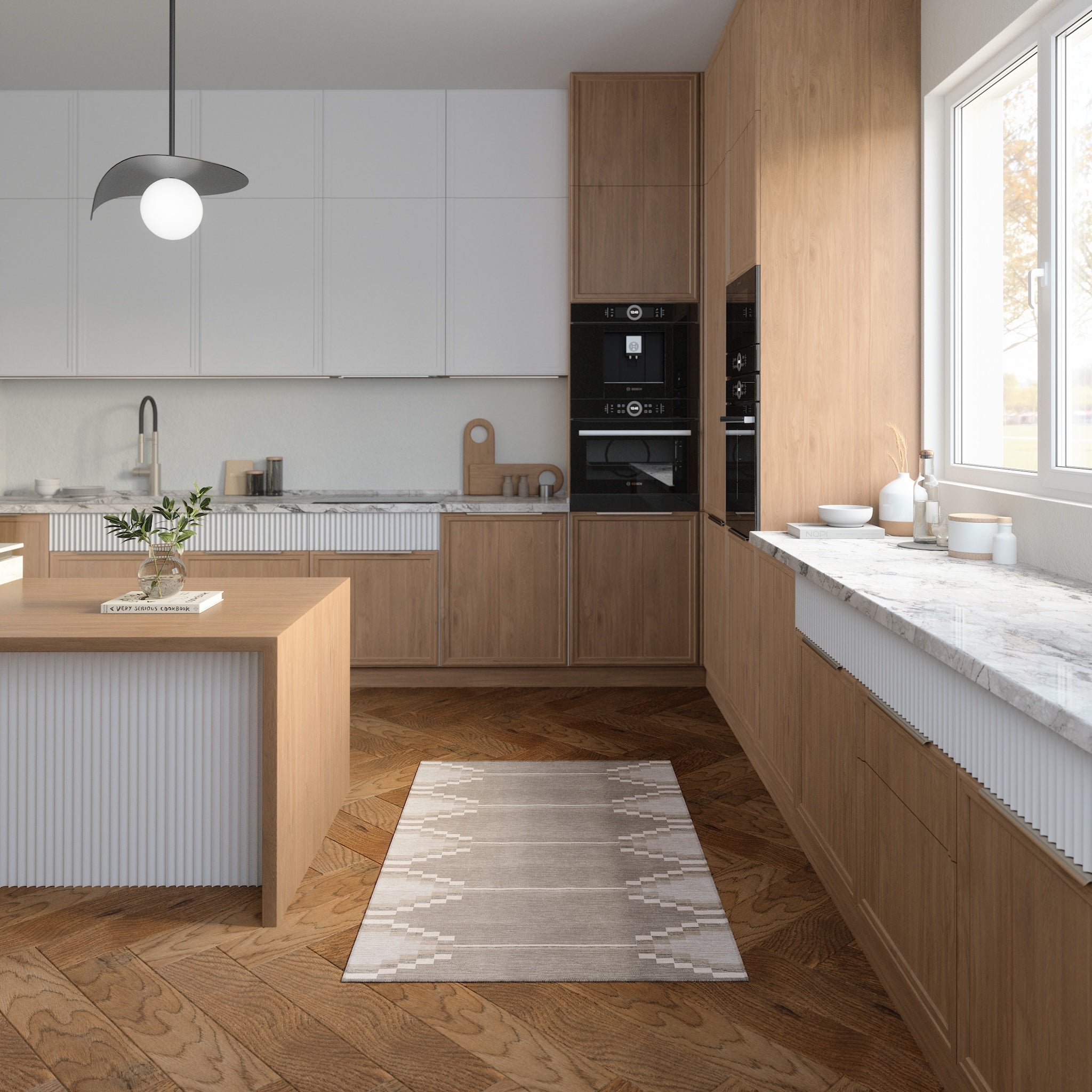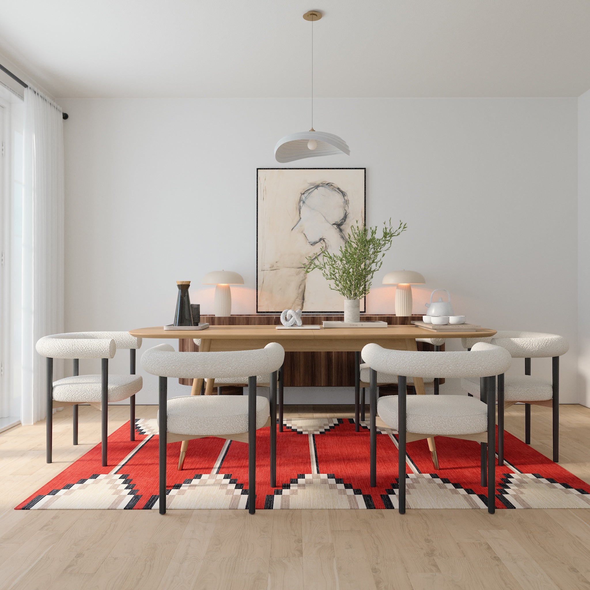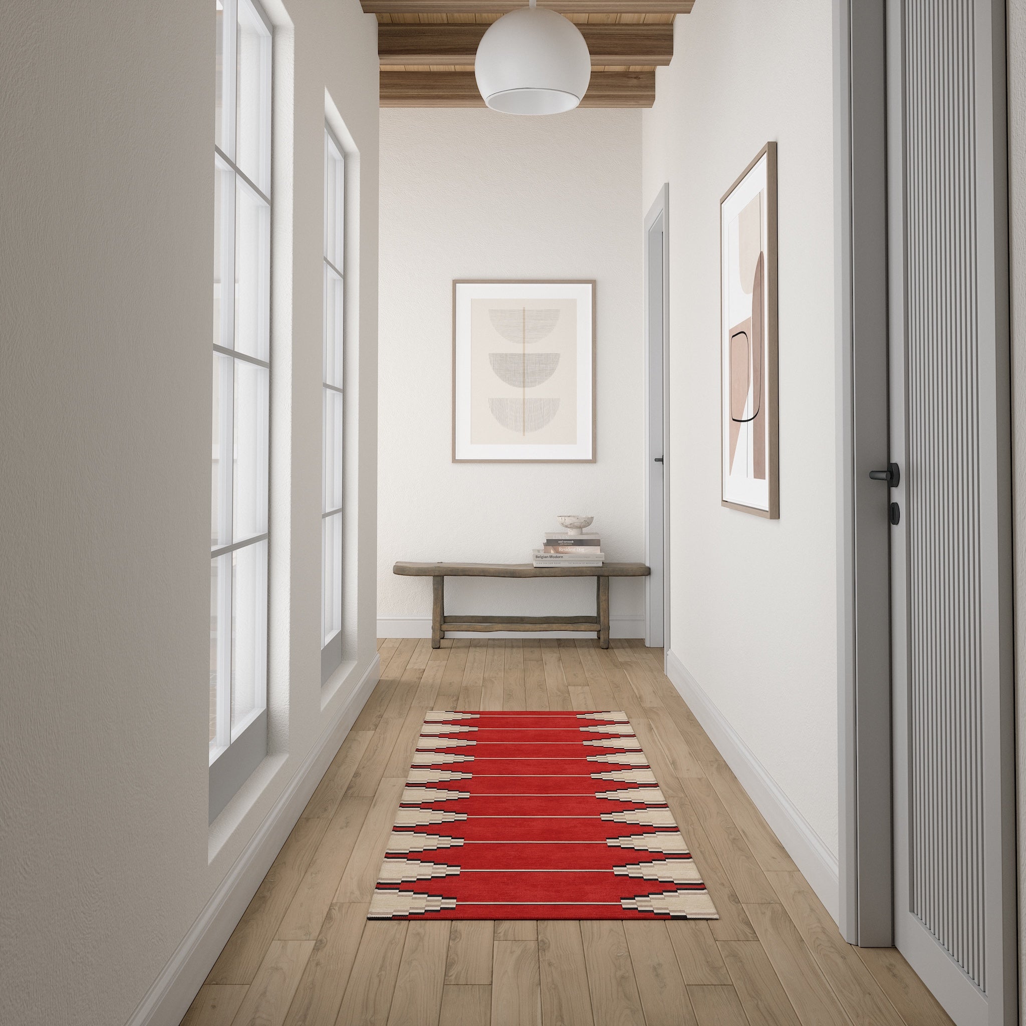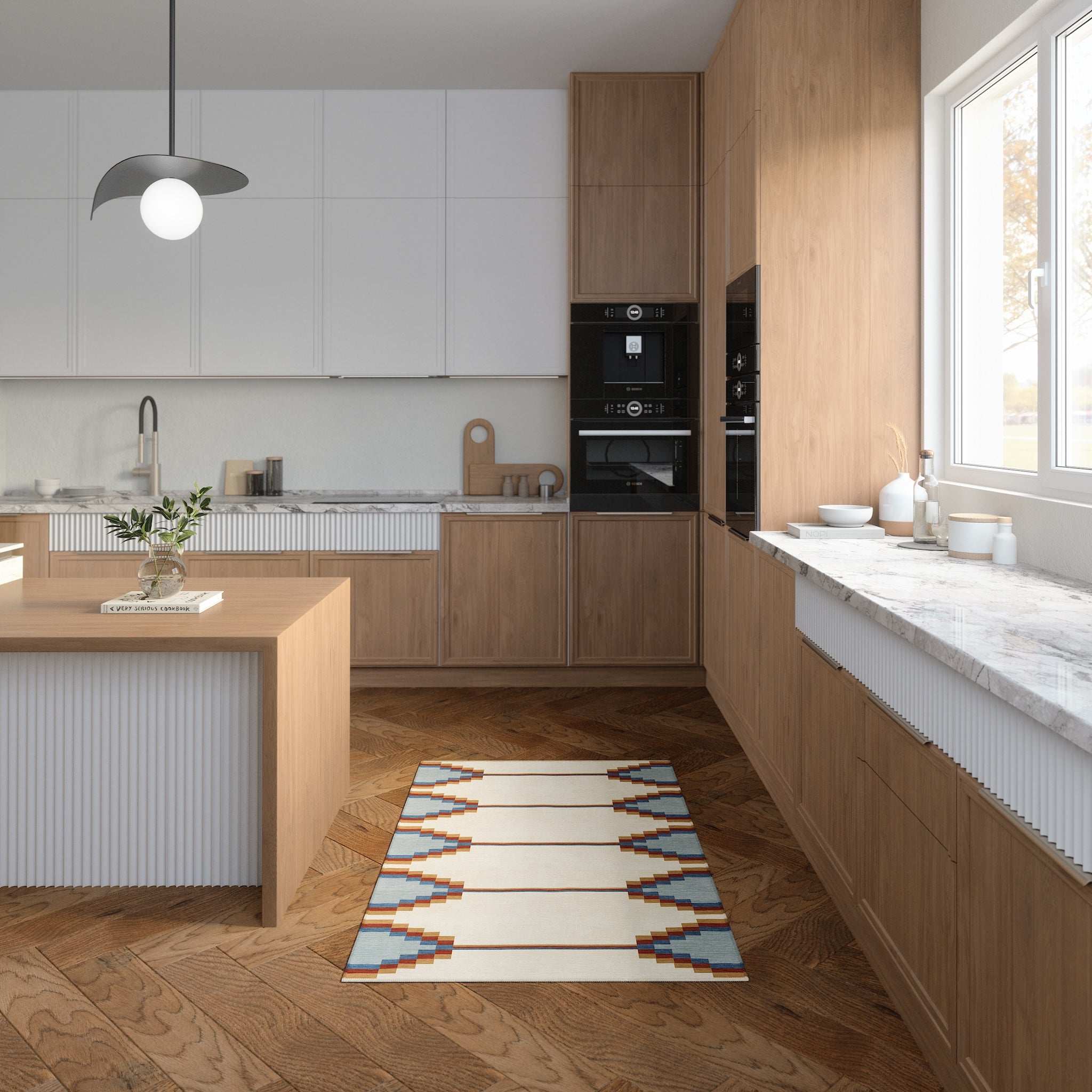 The Sierra rug features a bold geometric pattern with Southwestern-inspired elements, bringing a modern edge to any room. Its structured design and neutral tones offer a striking balance of simplicity and detail. This machine washable rug is both practical and stylish, making it an ideal addition to living rooms, dining areas, or offices.