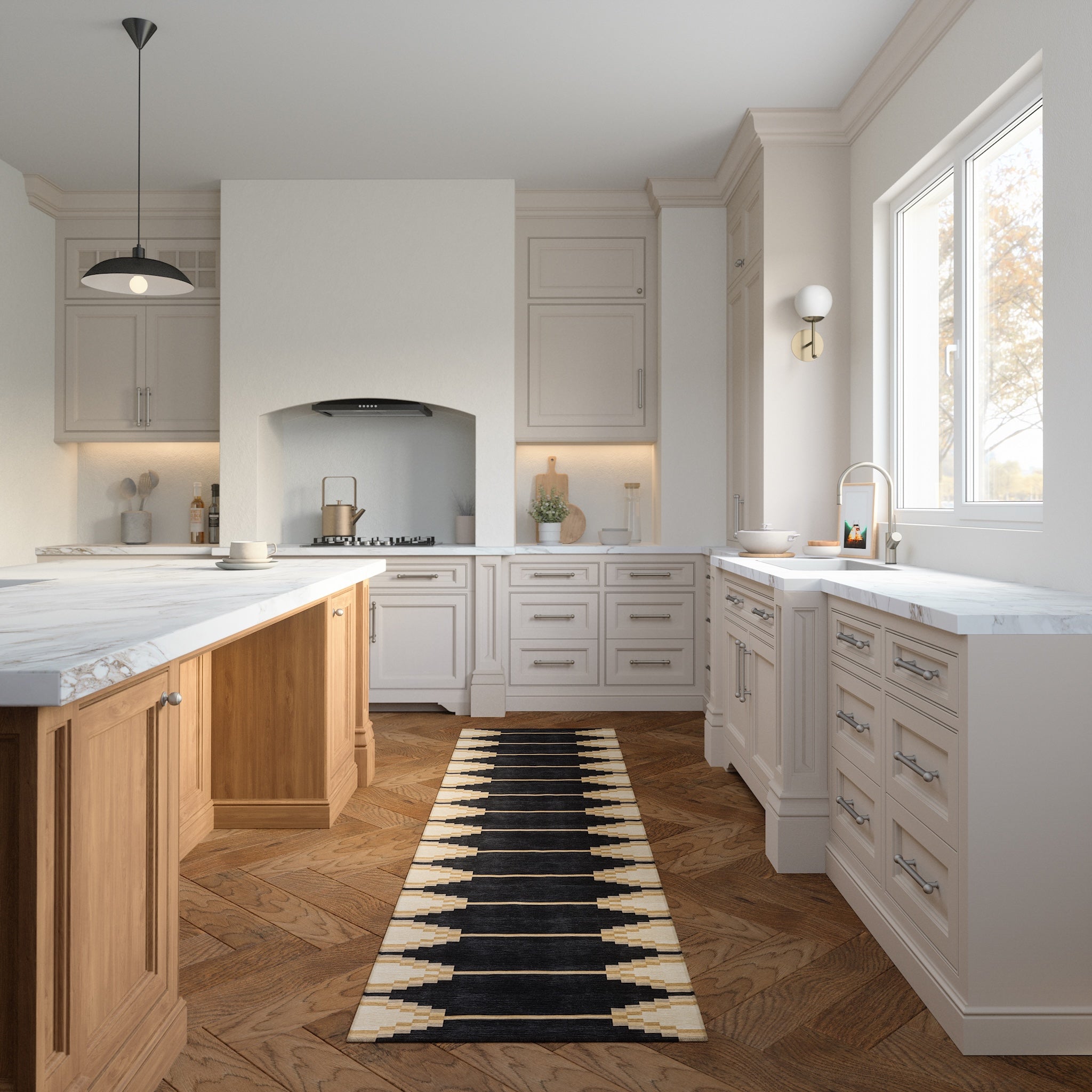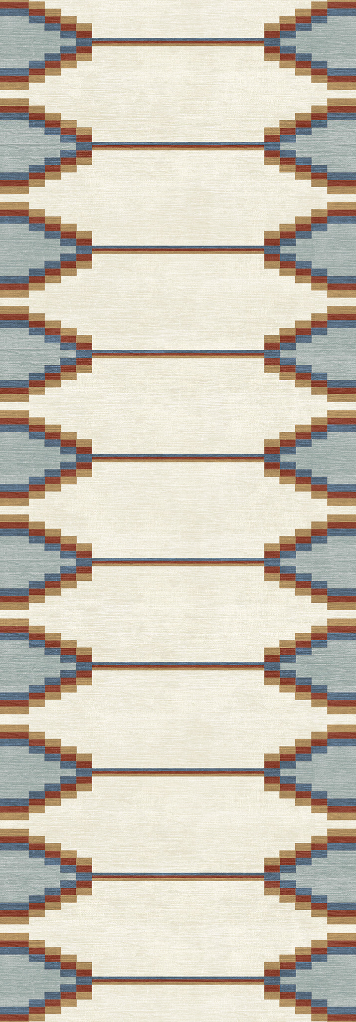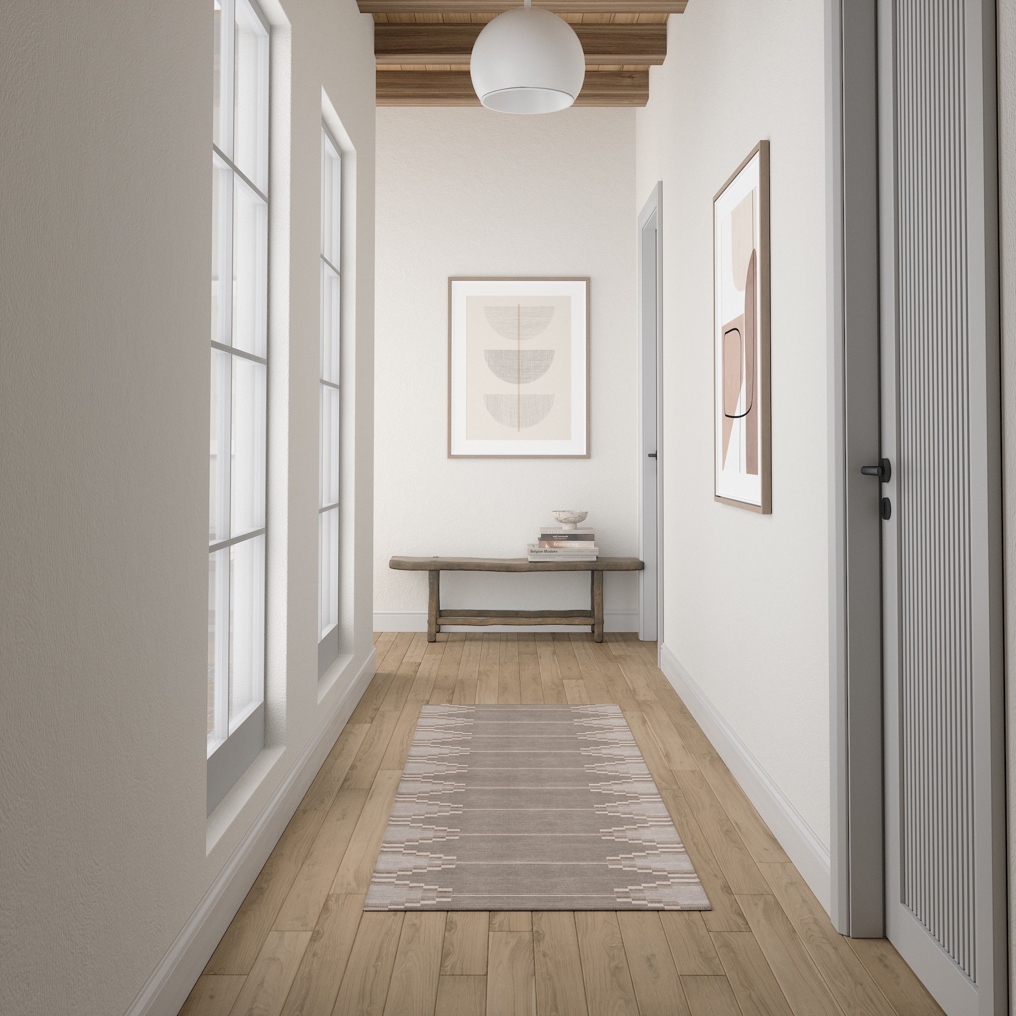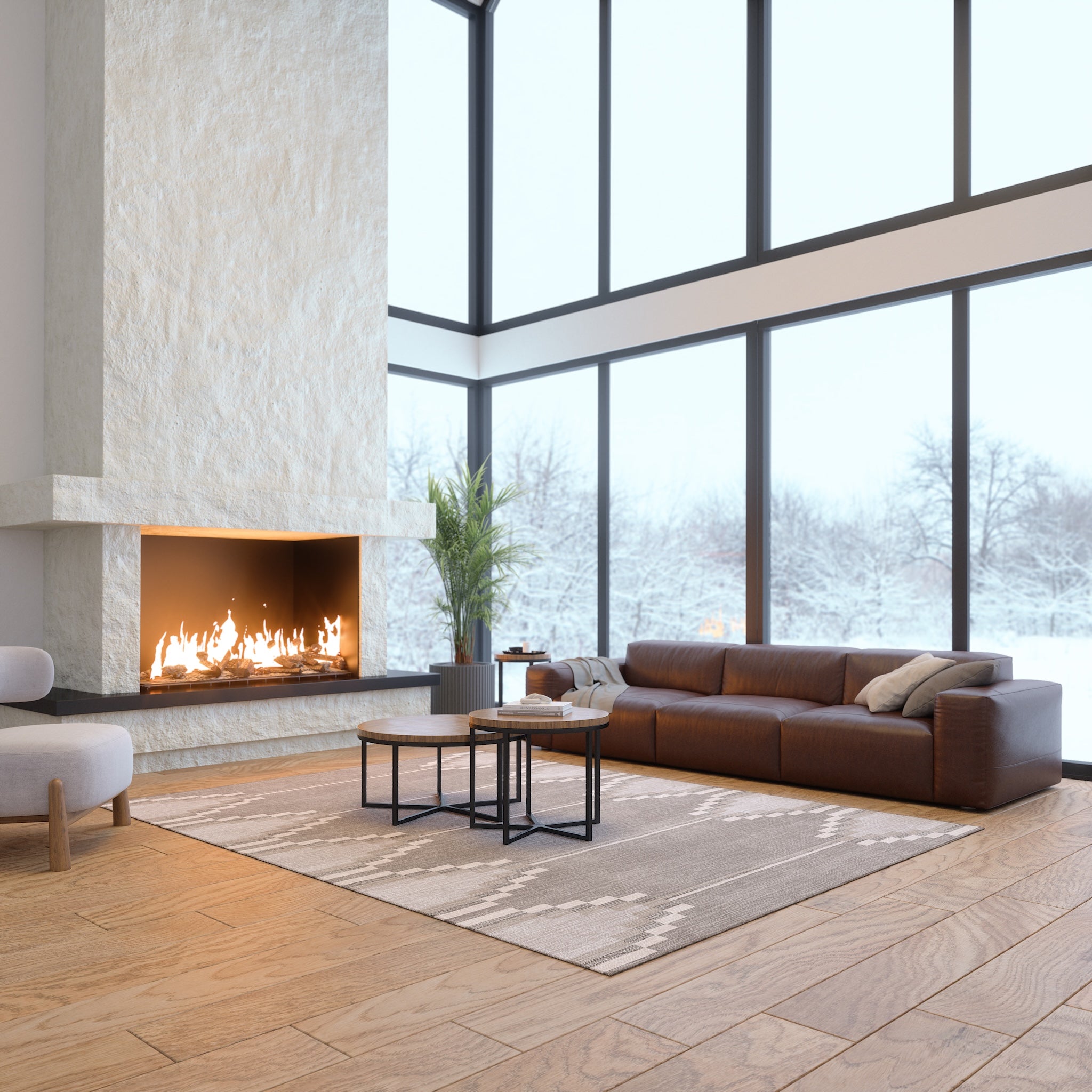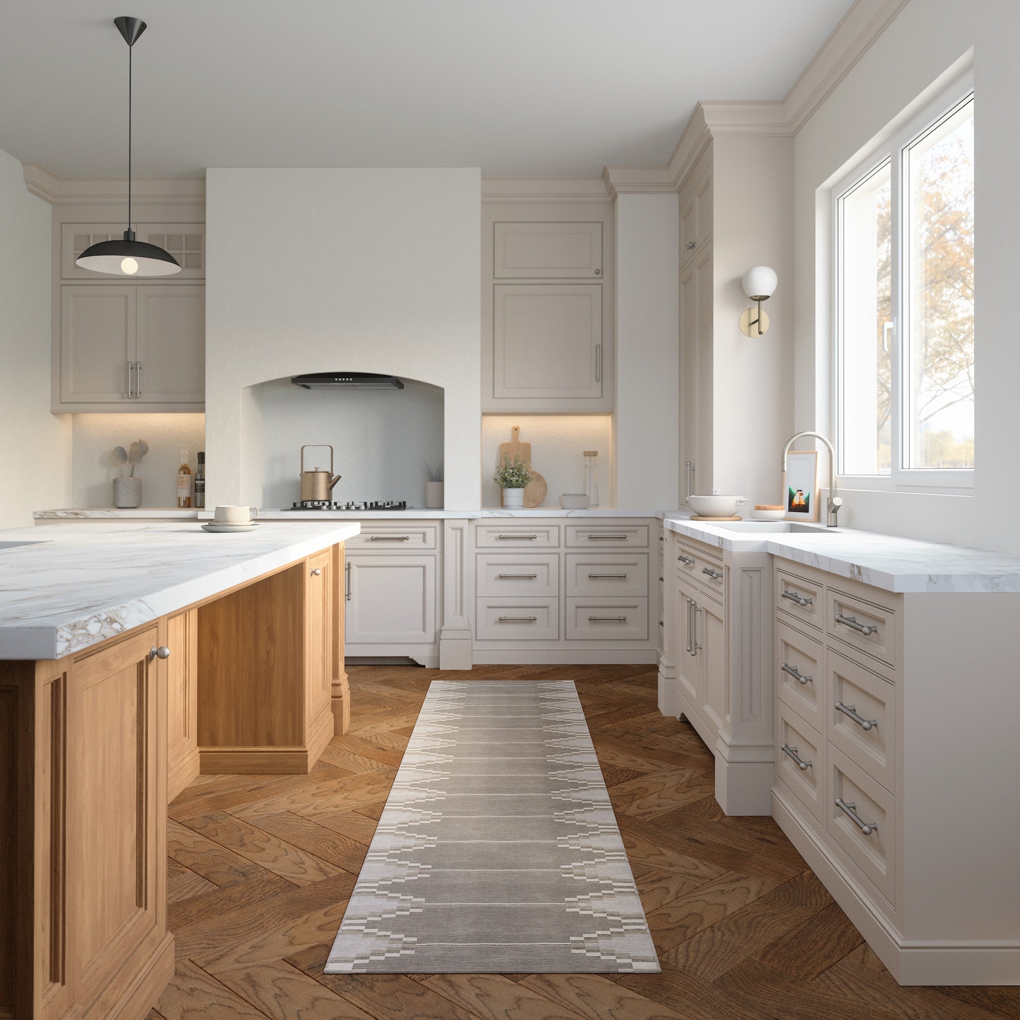 The Sierra rug features a bold geometric pattern with Southwestern-inspired elements, bringing a modern edge to any room. Its structured design and neutral tones offer a striking balance of simplicity and detail. This machine washable rug is both practical and stylish, making it an ideal addition to living rooms, dining areas, or offices.