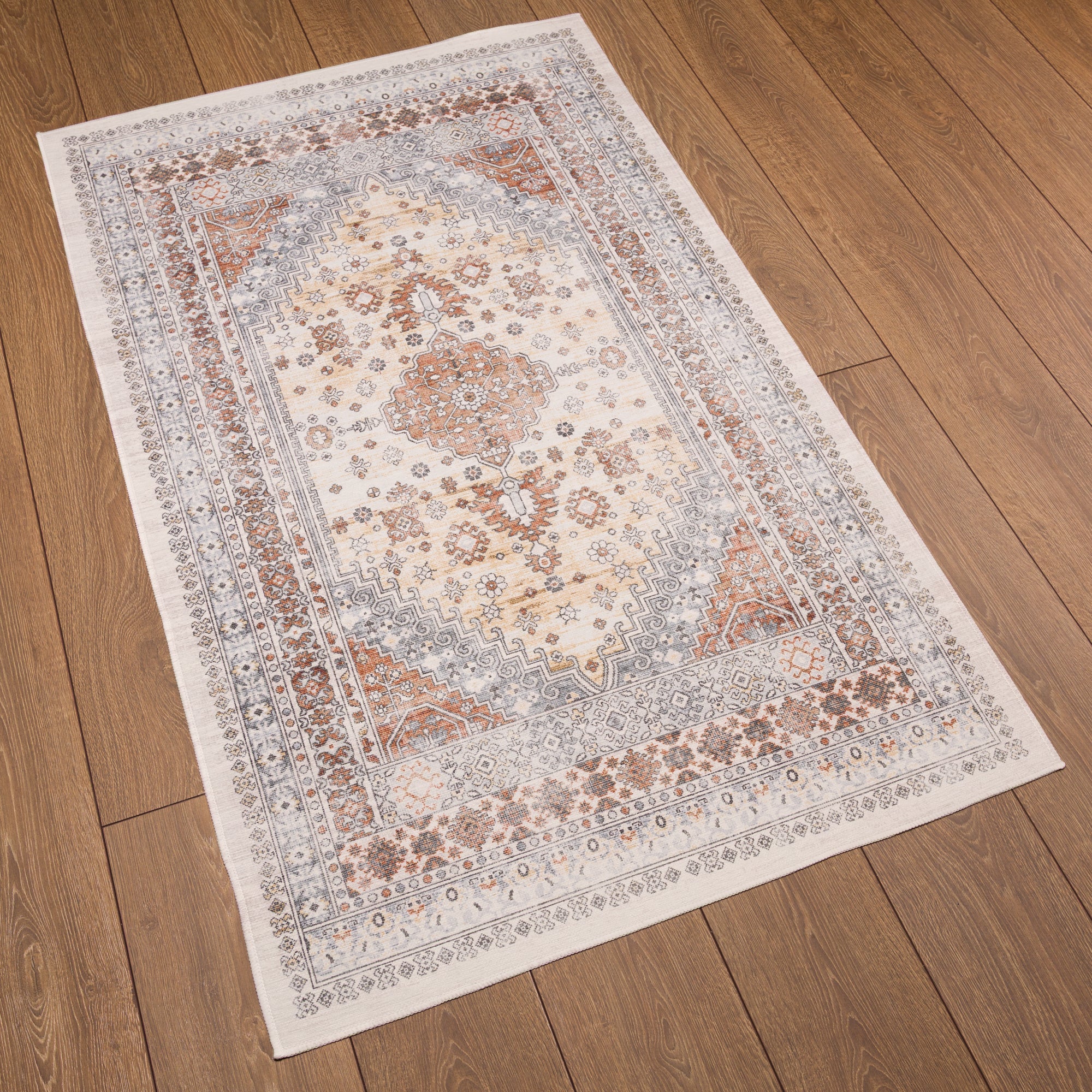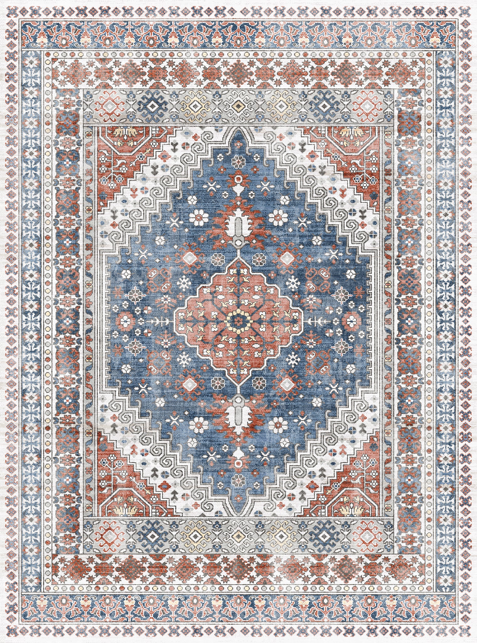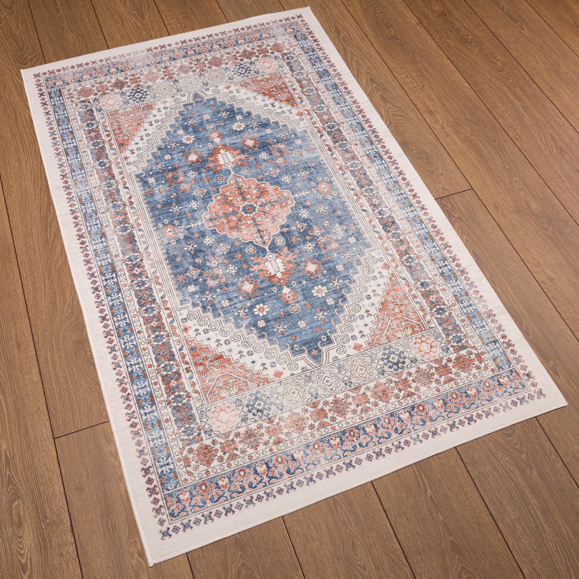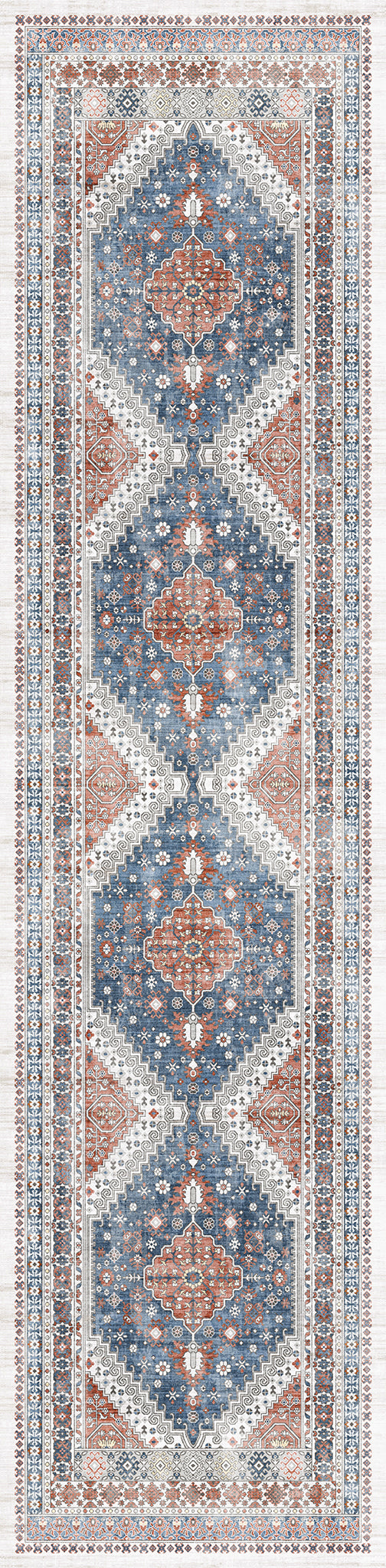 The Valencia rug features a timeless medallion design, beautifully crafted with rich tones of blue, terra, and grey. Its intricate detailing adds an air of sophistication, making it a perfect centerpiece for living rooms, bedrooms, or dining spaces. With its easy-to-maintain machine-washable fabric, the Valencia rug offers both elegance and practicality, ideal for busy households.