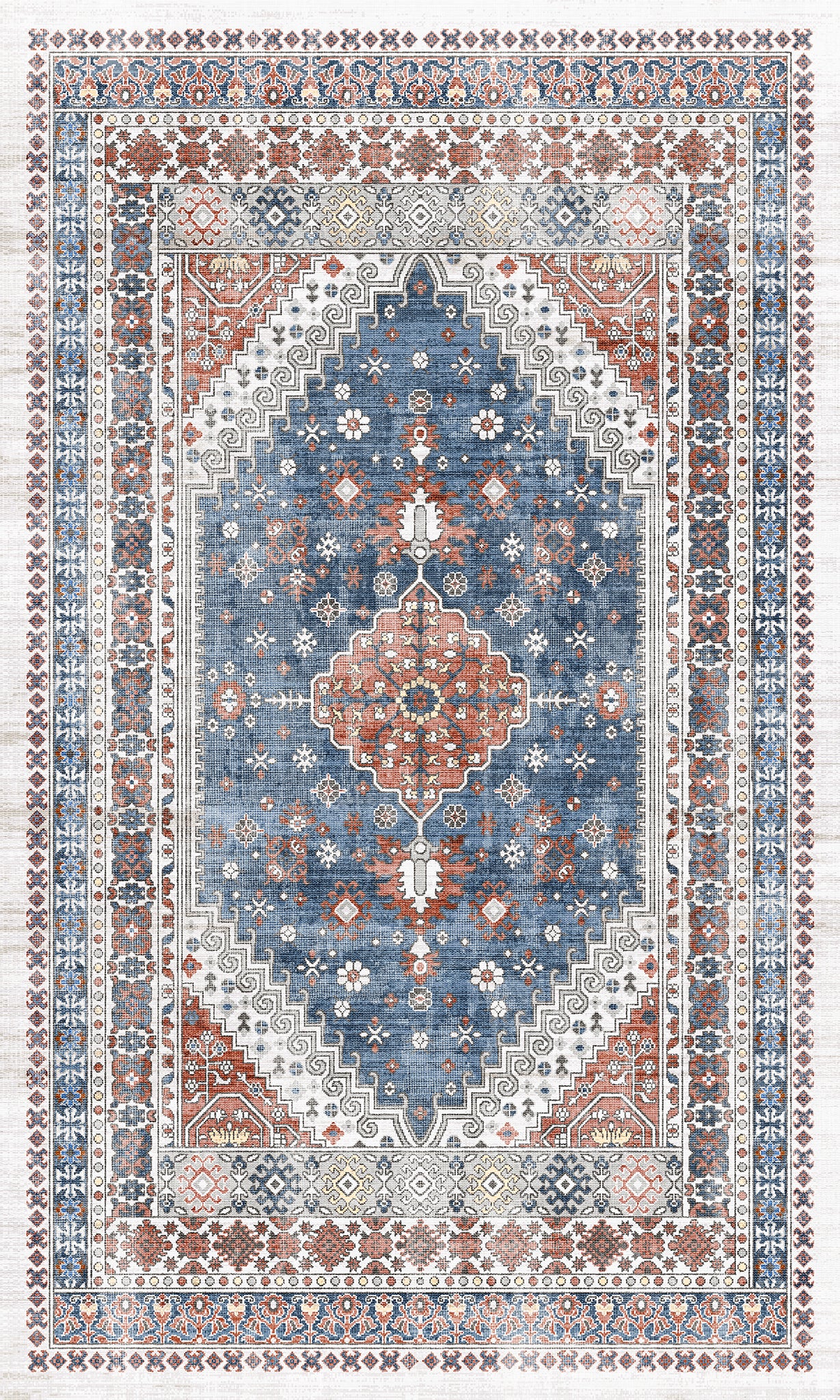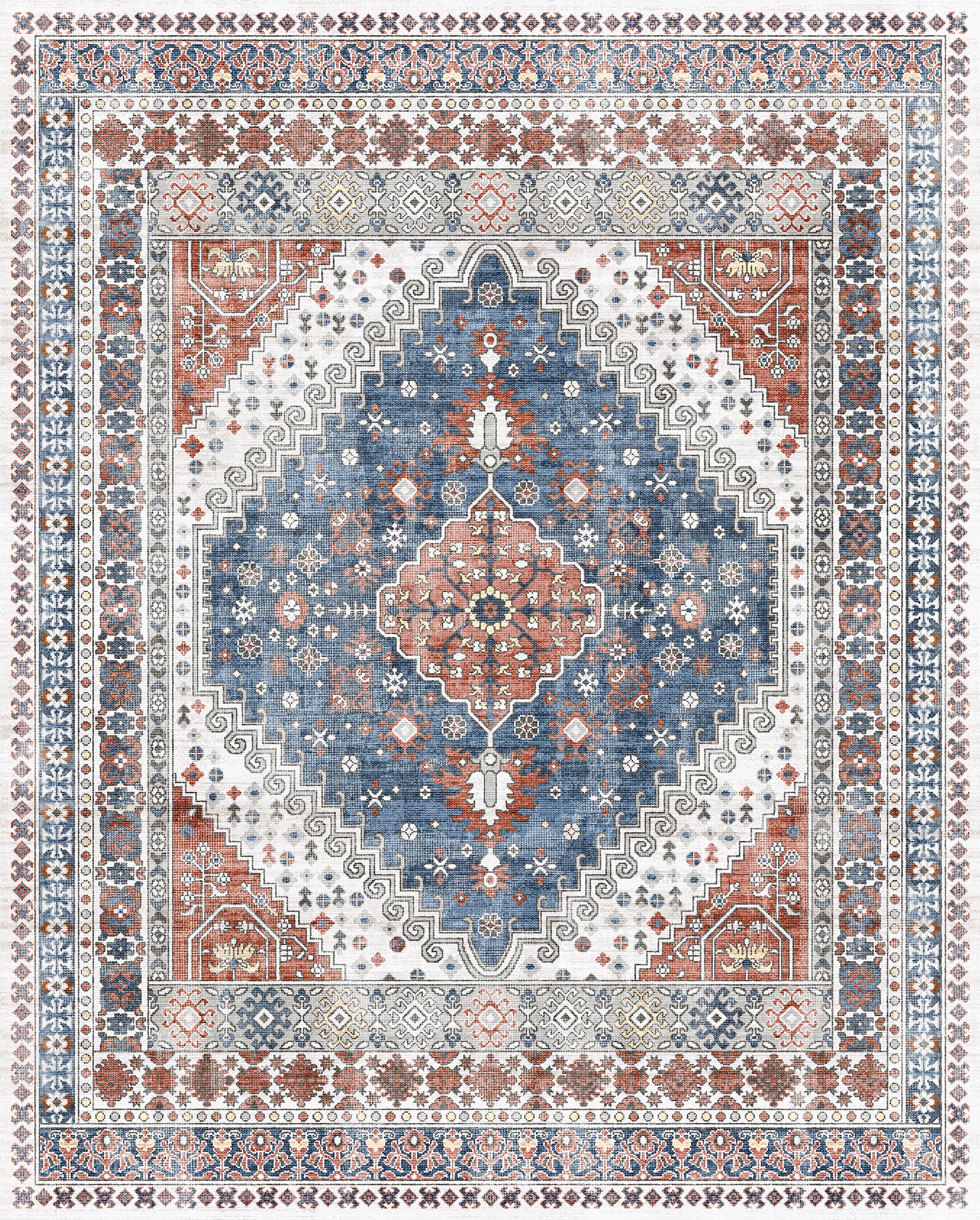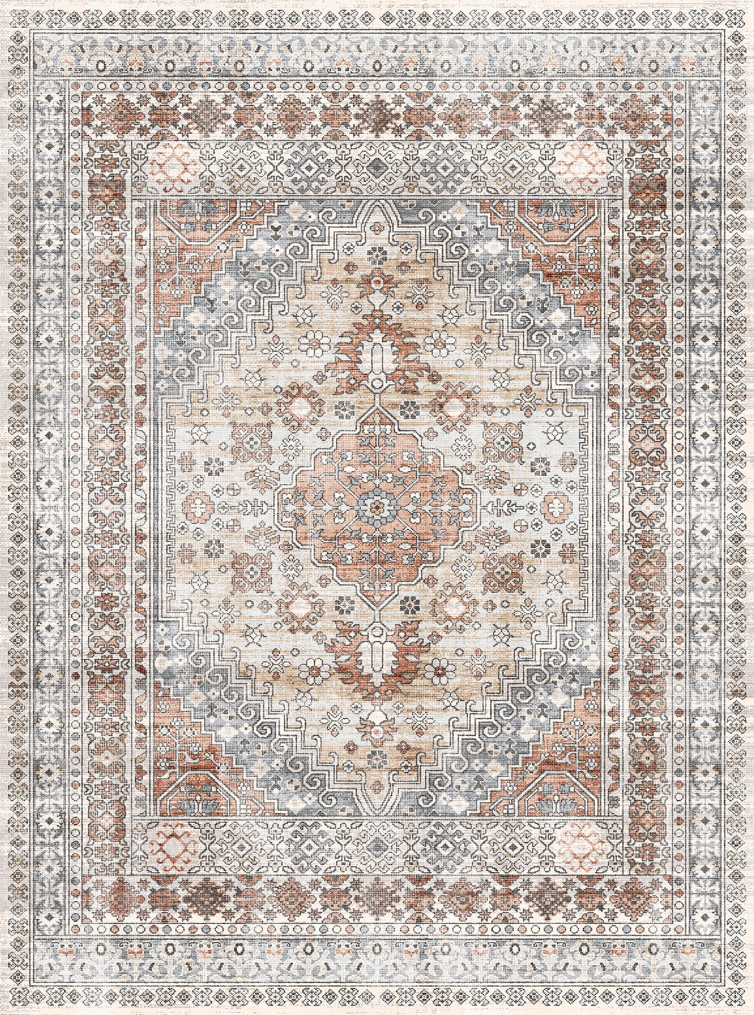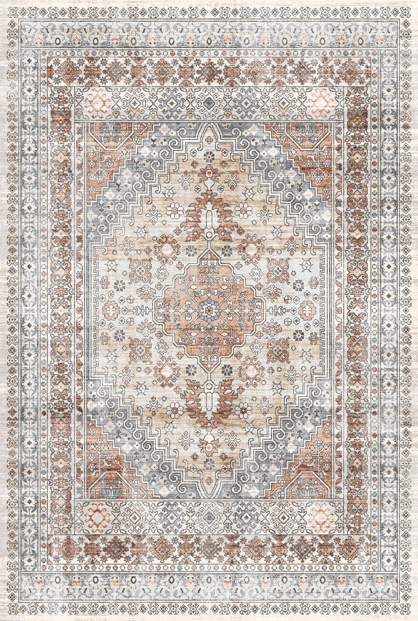The Valencia rug features a timeless medallion design, beautifully crafted with rich tones of blue, terra, and grey. Its intricate detailing adds an air of sophistication, making it a perfect centerpiece for living rooms, bedrooms, or dining spaces. With its easy-to-maintain machine-washable fabric, the Valencia rug offers both elegance and practicality, ideal for busy households.