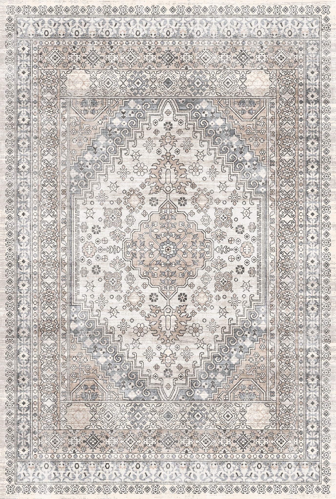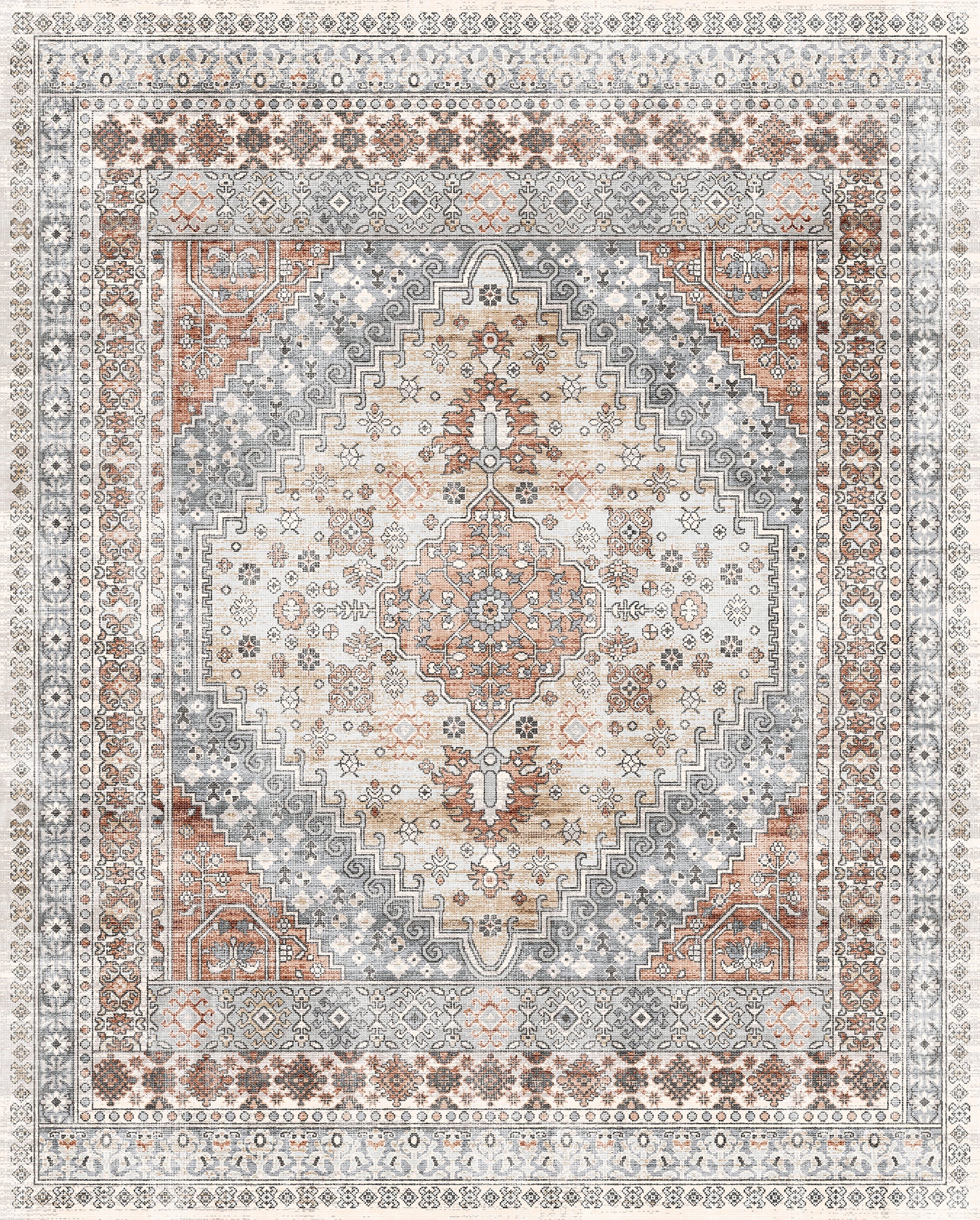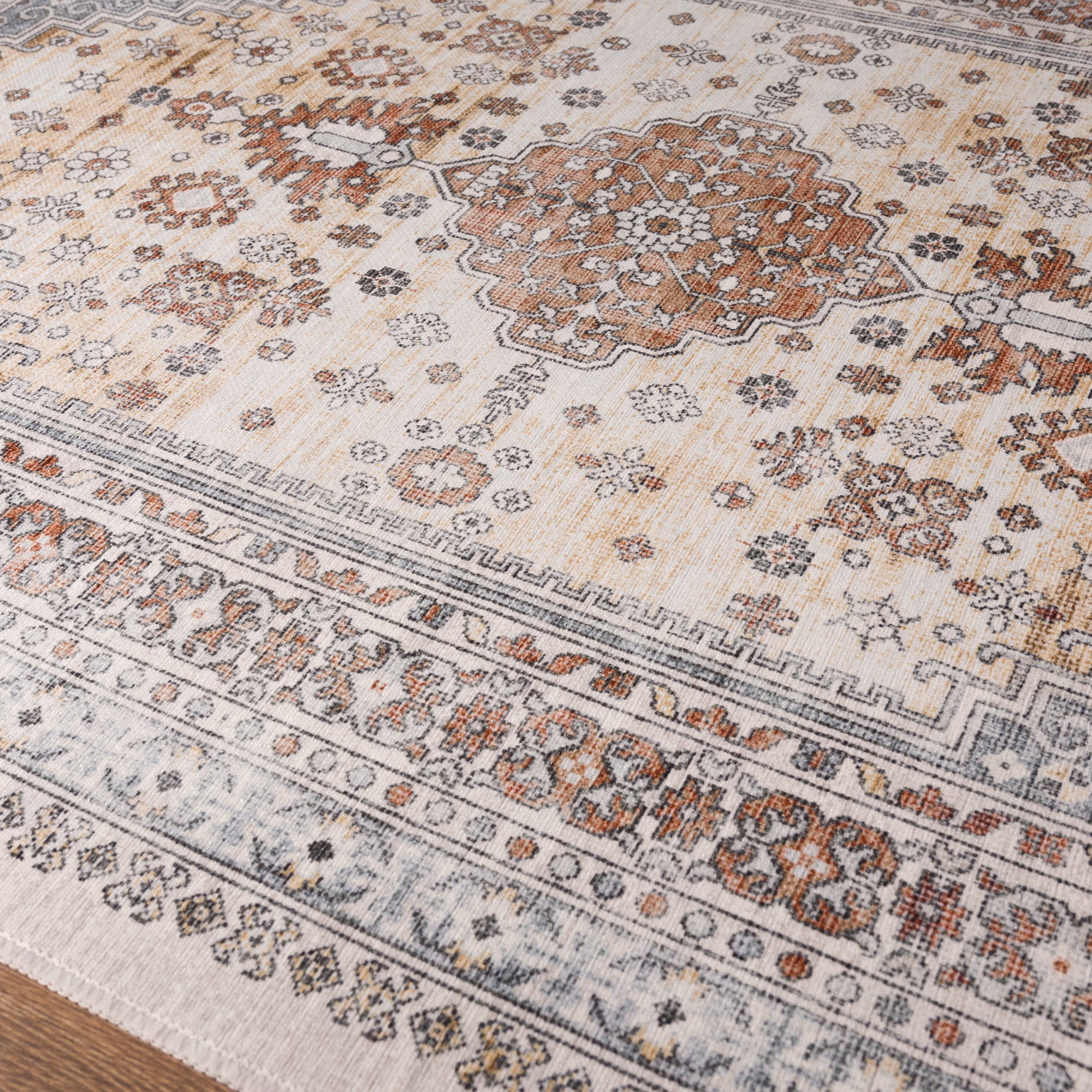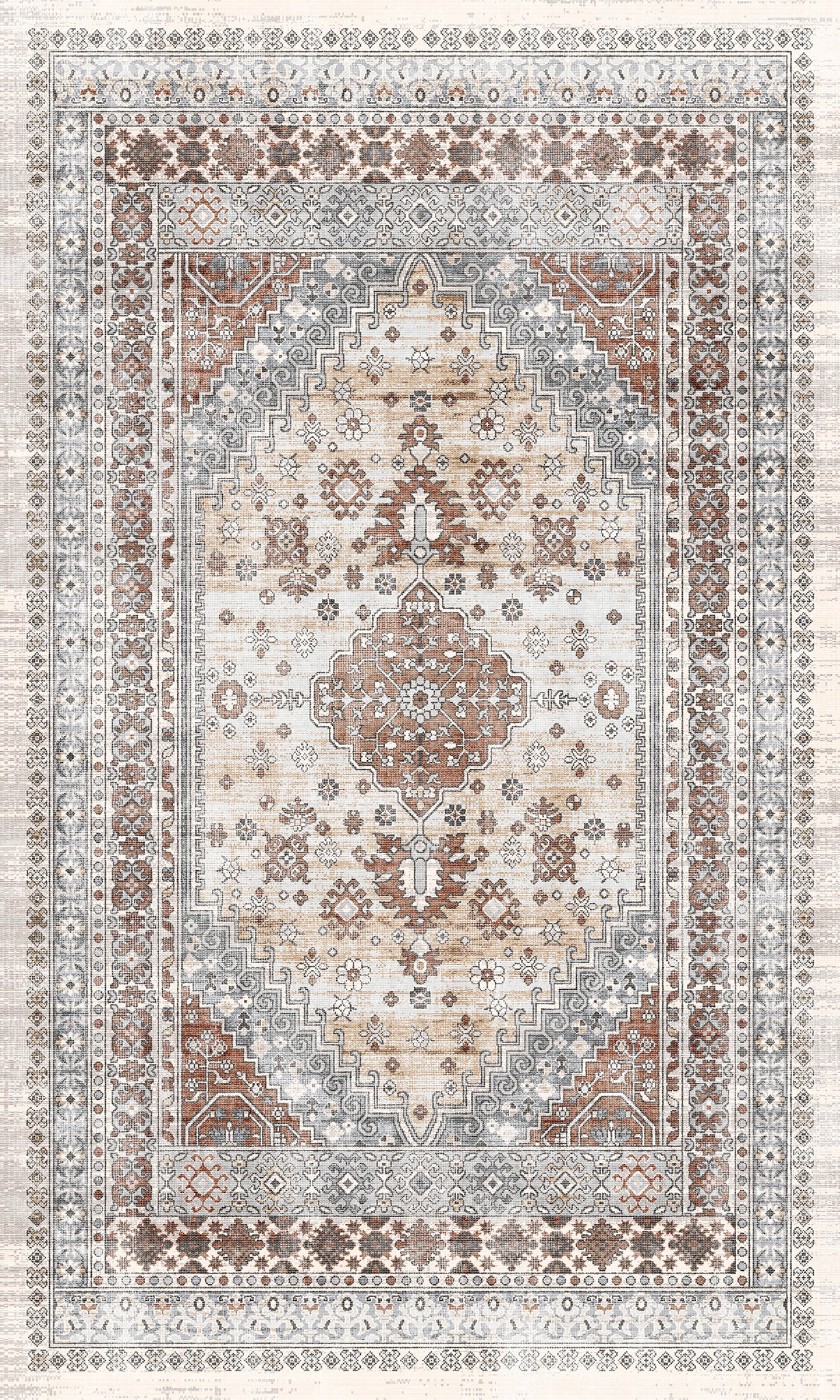 The Valencia rug features a timeless medallion design, beautifully crafted with rich tones of blue, terra, and grey. Its intricate detailing adds an air of sophistication, making it a perfect centerpiece for living rooms, bedrooms, or dining spaces. With its easy-to-maintain machine-washable fabric, the Valencia rug offers both elegance and practicality, ideal for busy households.